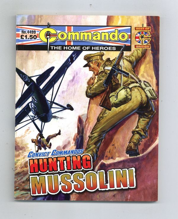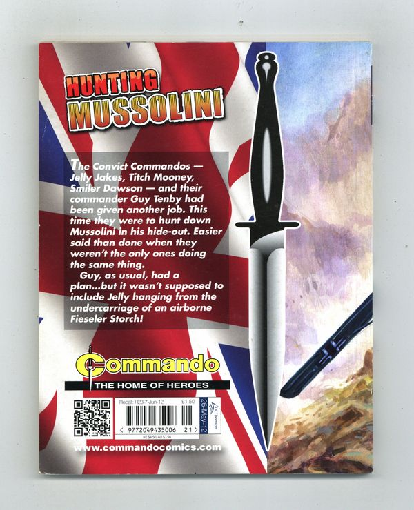 Published May 2012 by D. C. Thomson & Co..$8.49Convict Commandos: Hunting Mussolini - Written by Alan Hebden. Art and Cover by Manuel Benet. The Convict Commandos -- Jelly Jakes, Titch Mooney, Smiler Dawson -- and their commander Guy Tenby had been given another job. This time, they were to hunt down Mussolini in his hide-out. Easier said than done when they weren't the only ones doing the same. Guy, as usual, had a plan...but it wasn't supposed to include Jelly hanging from the undercarriage of an airborne Fieseler Storch! Weekly British War comics digest. Softcover, 5 1/2-in. x 6 1/2-in., 68 pages, B&W.
