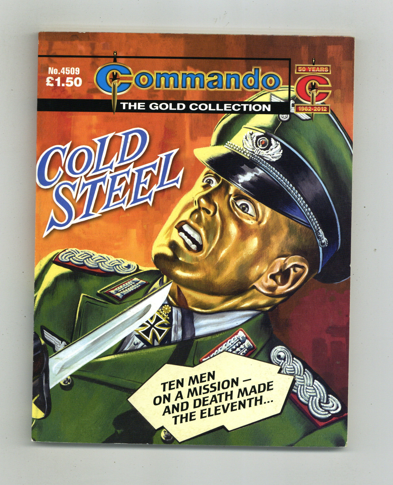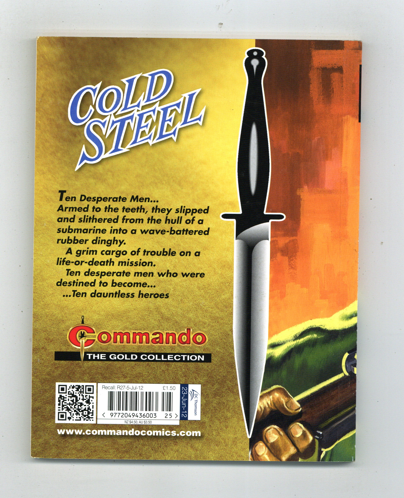 Reprinting Commando War Stories in Pictures (1961 D. C. Thomson Digest) #22: Cold Steel - Written by Jim Kenner. Art by Gordon Livingstone. Cover by Ken Barr. Armed to the teeth, they slipped and slithered from the hull of a submarine into a wave-battered rubber dinghy. A grim cargo of trouble on a life-or-death mission. Ten desperate men who were destined to become...ten dauntless heroes. Weekly British War comics digest. Softcover, 5 1/2-in. x 6 1/2-in., 68 pages, B&W.