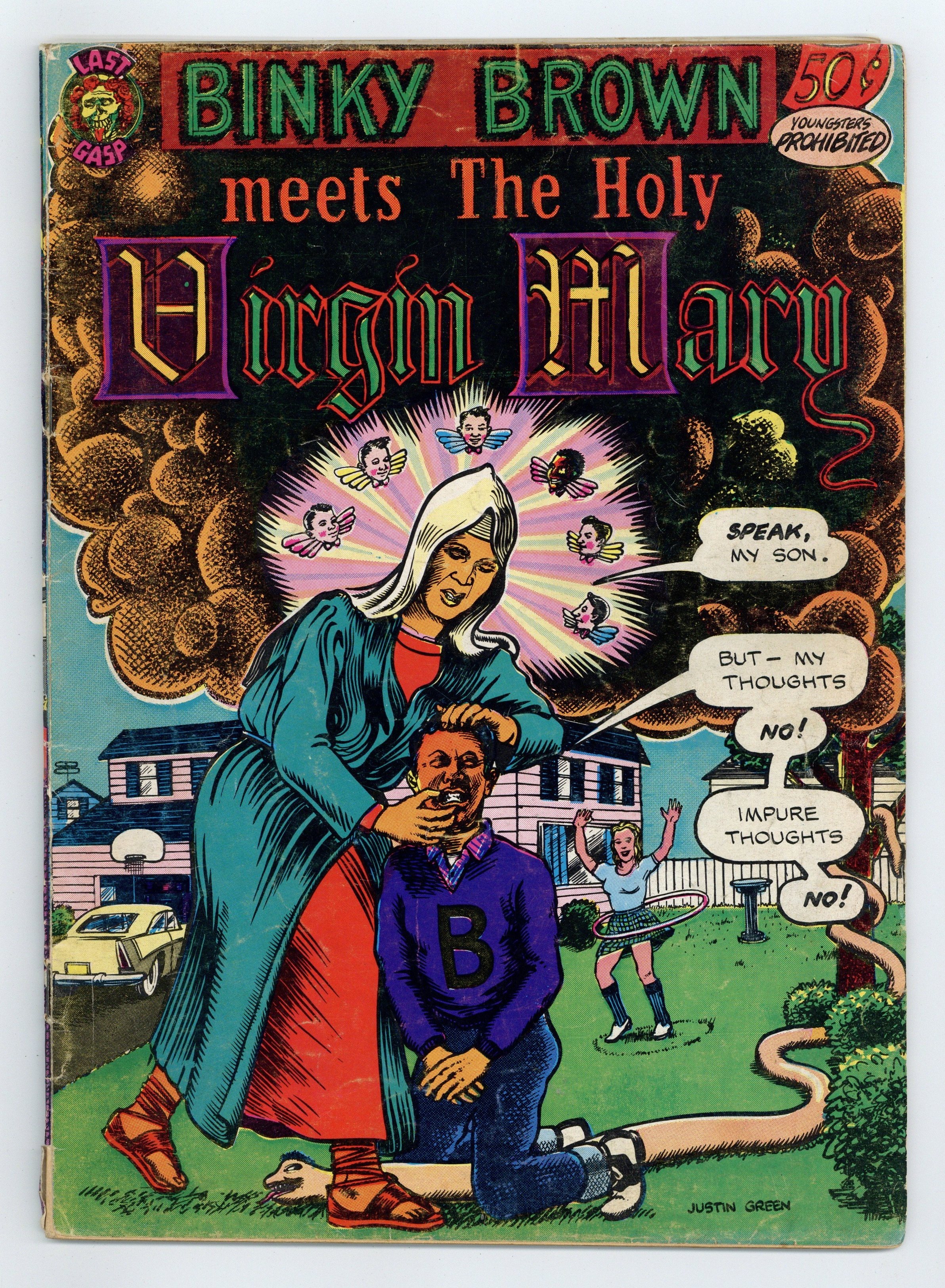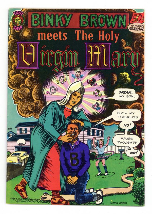 1st printing. Virgin Mary drawn behind text on bottom left section of pg. 23. Written and drawn by Justin Green. Adults Only, 7 1/4" x 10", b&w, 44 pages. Cover price $0.50.