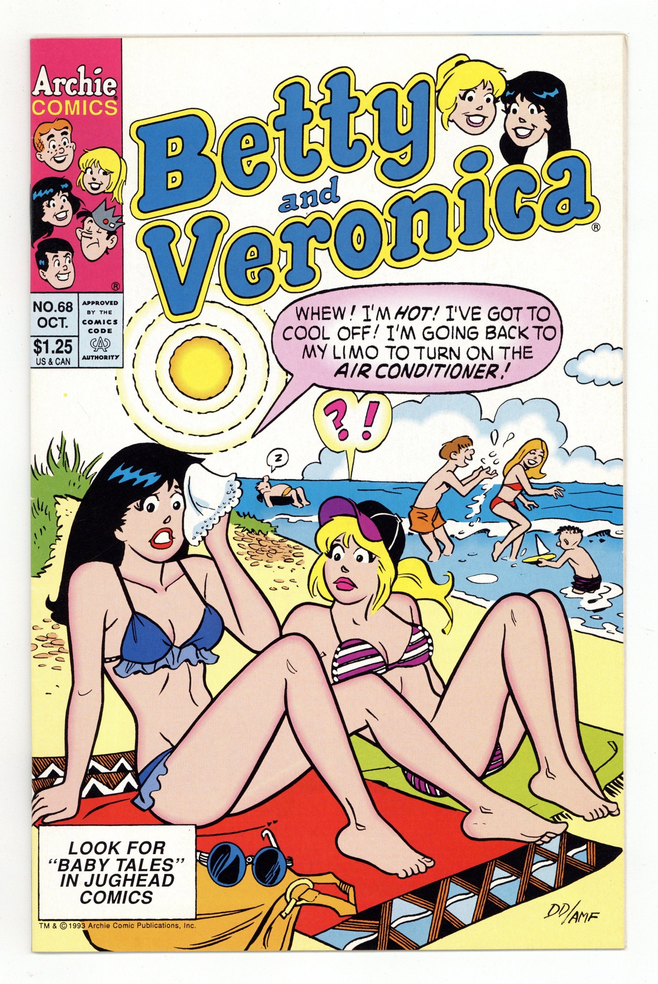 Cover pencils by Dan DeCarlo, inks by Alison Flood. "The Changeling," script by Frank Doyle, pencils by Dan DeCarlo, inks by Alison Flood; Veronica chastises Betty for going running in the hot summer but invites her over afterward to use her pool. "Spot Check," script by Mike Pellowki, pencils by Dan DeCarlo inks by Alison Flood; Betty gets a big pimple before a date with Archie and tries everything to cover it up. Recycling public service announcement with the Archie gang. "Balls of Ire," script by Frank Doyle, pencils by Dan DeCarlo, inks by Alison Flood; Veronica has three beach balls made, each with a photo of Archie, Reggie and Jughead on them. "There's Such a Thing as Being Too Rich," script by Hal Smith, pencils by Dan DeCarlo, inks by Alison Flood; A genie grants Veronica two wishes. Betty and Veronica fashion page featuring black and white clothing. 36 pgs., full color. Cover price $1.25.