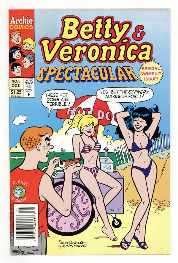 Tags: ArchiePublished Oct 1993 by Archie Publications.$30.00Written by Dan Parent and Bill Golliher. Art by Dan DeCarlo, Dan Parent, and Alison Flood. Cover by Dan DeCarlo and Alison Flood. Betty and Archie agree to staff Pop Tate's Hot Dog Cart at the local beach. Betty and Veronica decide to give Archie and Reggie a taste of their own medicine by making racy remarks about them as the boys pass. Editor Gorelick recounts his experiences at the 1993 Kansas City Comic Book Convention. PET Plastic Containers public service announcement with the Archie gang. The 60's In The 90's fashion page with Betty And Veronica by Rex W. Lindsey. 36 pages, full color. $1.25. Cover price $1.25.