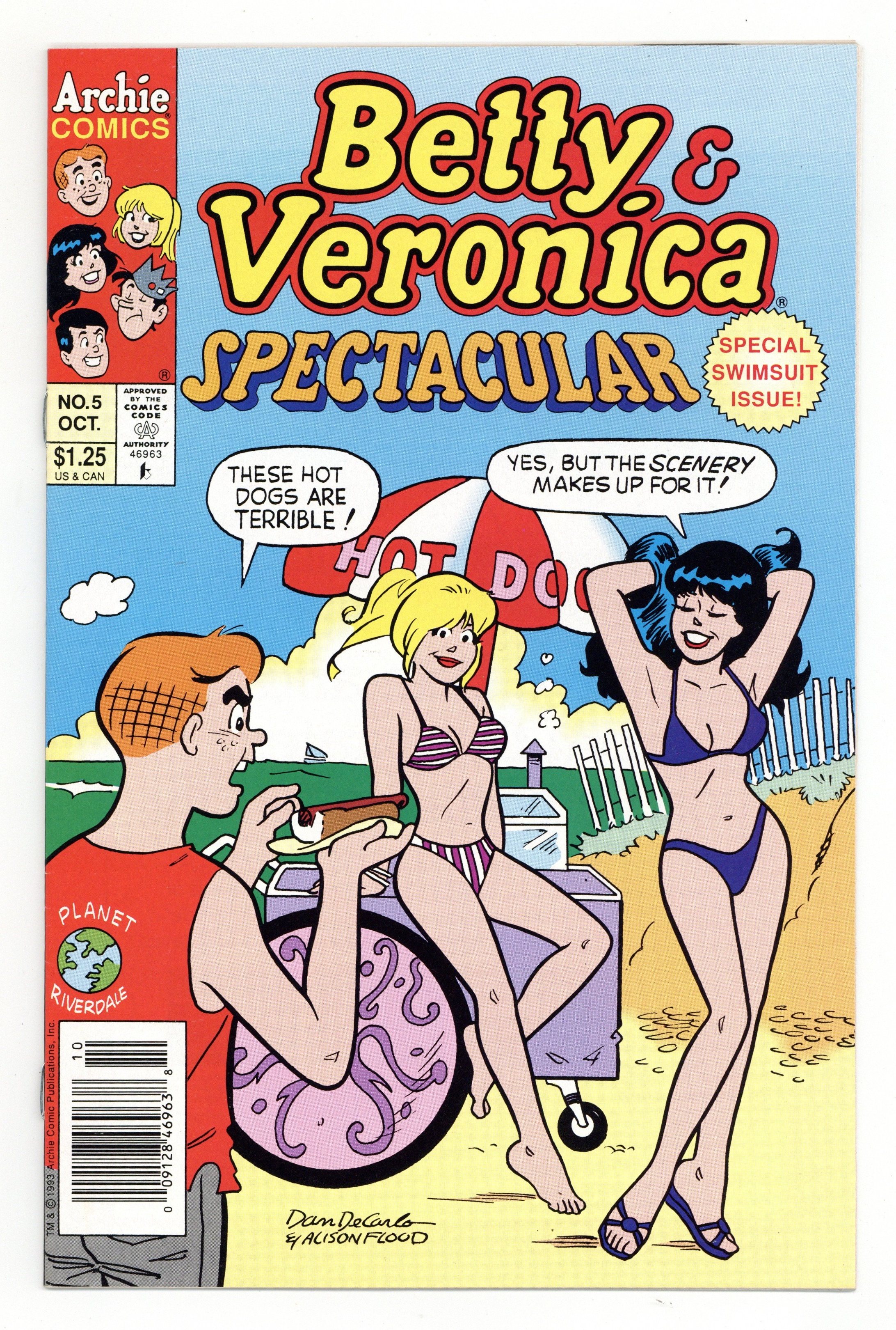 Tags: ArchiePublished Oct 1993 by Archie Publications.$26.00Written by Dan Parent and Bill Golliher. Art by Dan DeCarlo, Dan Parent, and Alison Flood. Cover by Dan DeCarlo and Alison Flood. Betty and Archie agree to staff Pop Tate's Hot Dog Cart at the local beach. Betty and Veronica decide to give Archie and Reggie a taste of their own medicine by making racy remarks about them as the boys pass. Editor Gorelick recounts his experiences at the 1993 Kansas City Comic Book Convention. PET Plastic Containers public service announcement with the Archie gang. The 60's In The 90's fashion page with Betty And Veronica by Rex W. Lindsey. 36 pages, full color. $1.25. Cover price $1.25.