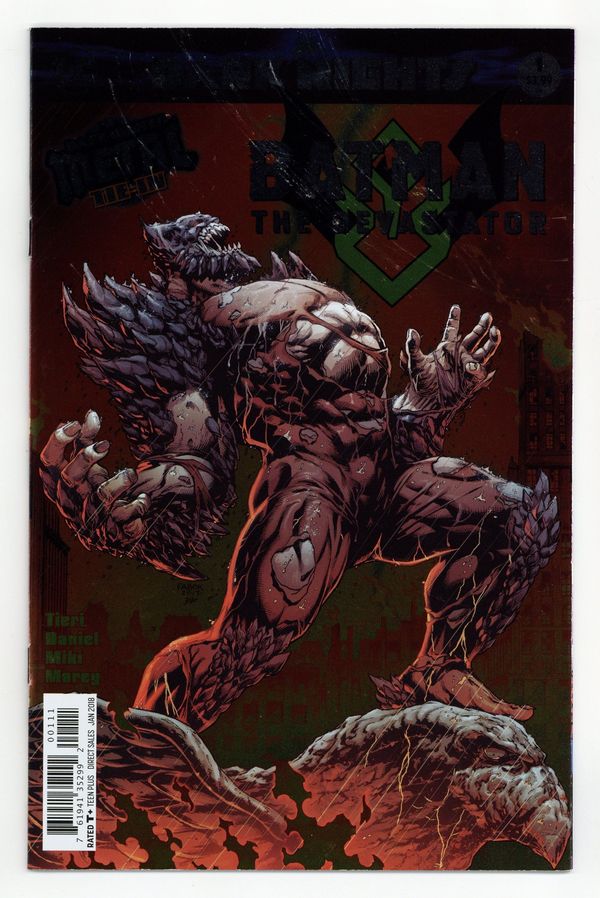 Tags: Dark Nights Metal (DC) (part 16), Batman$15.00Written by Frank Tieri and James Tynion. Art by Tony S. Daniel. Cover by Jason Fabok. As the events of DARK NIGHTS: METAL rock the DC Universe, the creatures of the Dark Multiverse stand ready to invade our world! How can the World's Greatest Heroes stop a horde of deadly beings that appear to be powerful nightmare versions of familiar figures? Find out in these special tie-in issues! 32 pages, full color. Rated T+ Cover price $3.99.