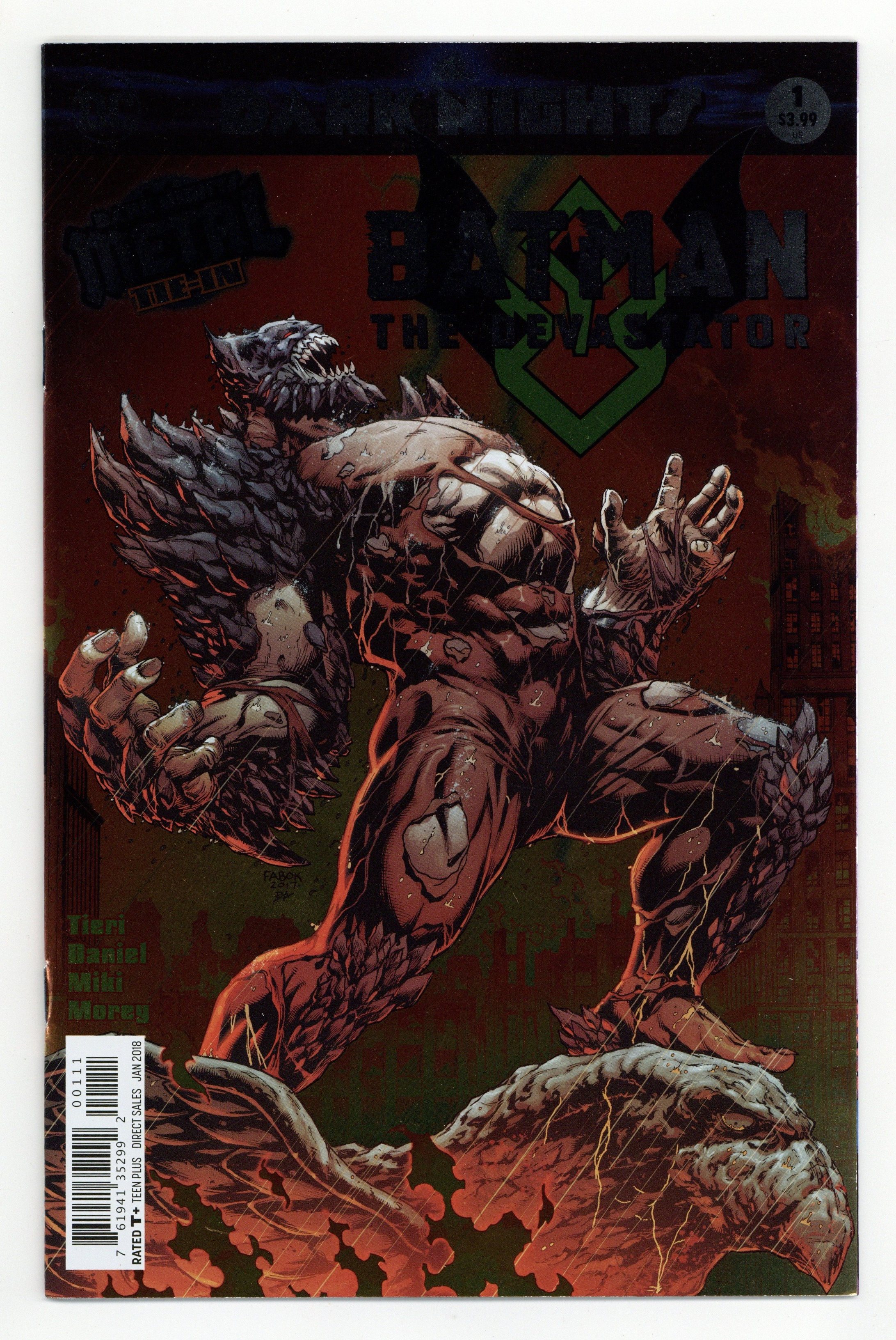 Written by Frank Tieri and James Tynion. Art by Tony S. Daniel. Cover by Jason Fabok. As the events of DARK NIGHTS: METAL rock the DC Universe, the creatures of the Dark Multiverse stand ready to invade our world! How can the World's Greatest Heroes stop a horde of deadly beings that appear to be powerful nightmare versions of familiar figures? Find out in these special tie-in issues! 32 pages, full color. Rated T+ Cover price $3.99.