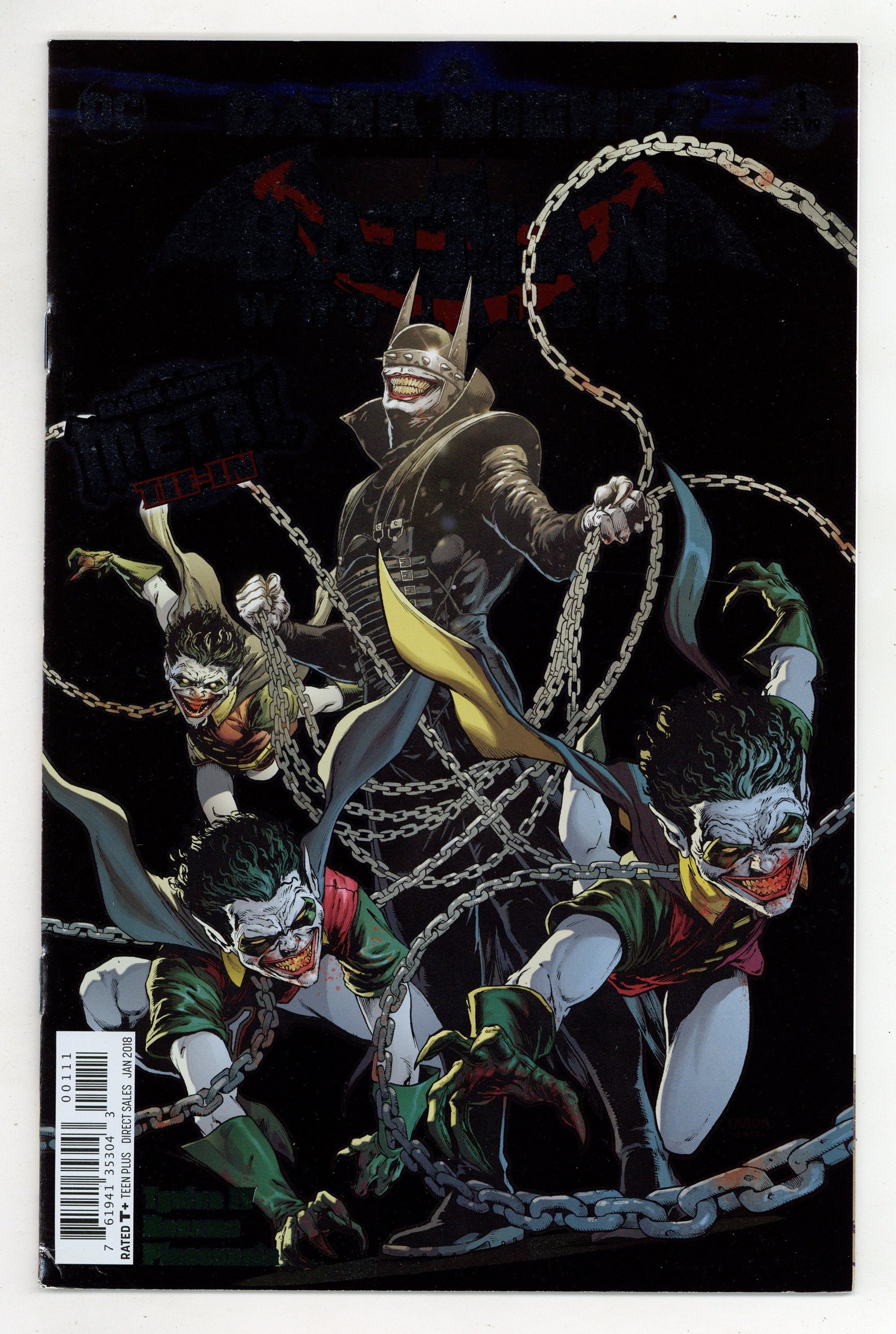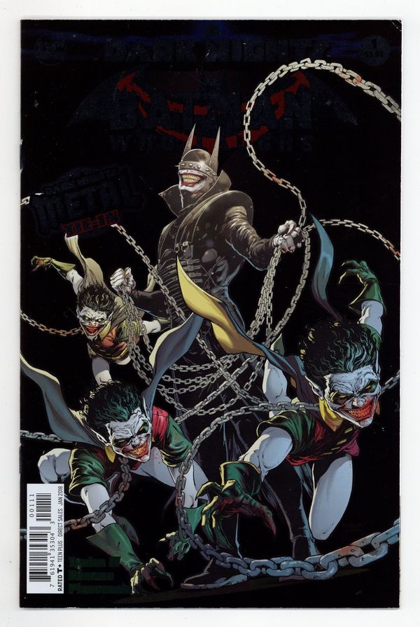 Tags: Dark Nights Metal (DC) (part 21), Batman$20.00Written by James Tynion IV. Art by Riley Rossmo. Cover by Jason Fabok. As the events of DARK NIGHTS: METAL rock the DC Universe, the creatures of the Dark Multiverse stand ready to invade our world! How can the World's Greatest Heroes stop a horde of deadly beings that appear to be powerful nightmare versions of familiar figures? Find out in these special tie-in issues! 32 pages, full color, Rated T+ Cover price $3.99.