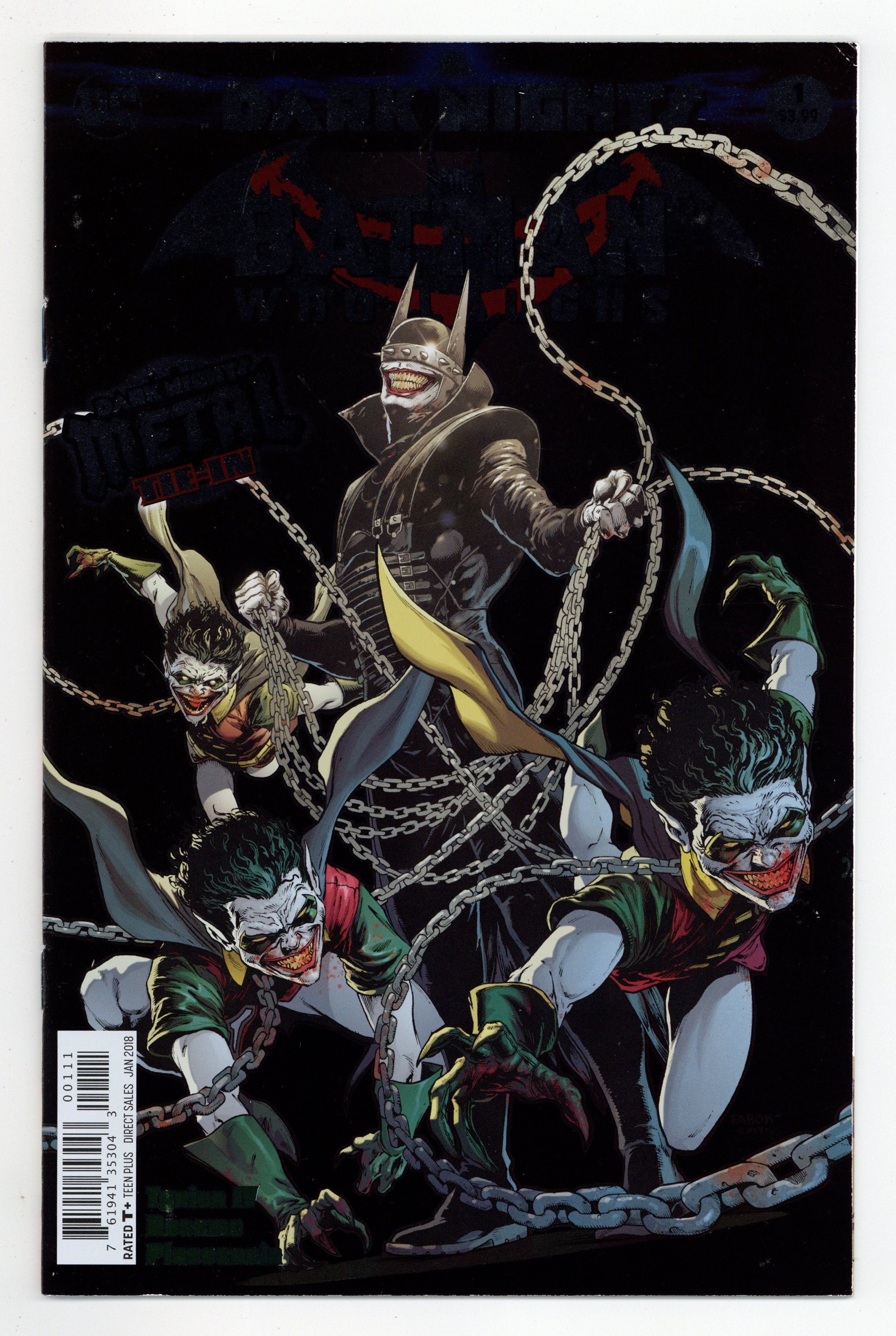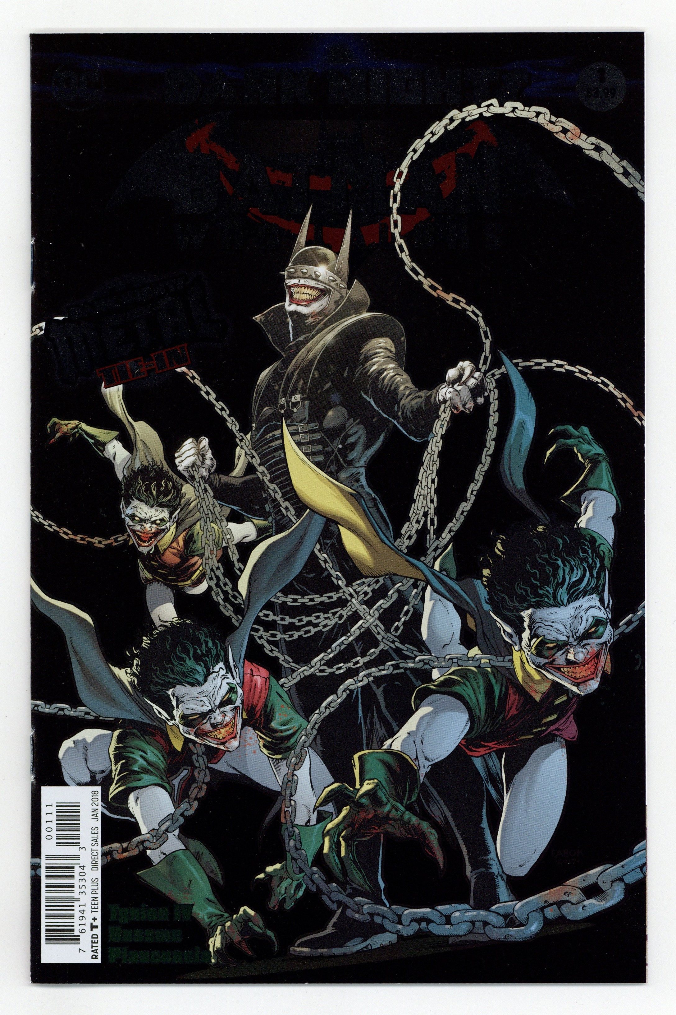 Written by James Tynion IV. Art by Riley Rossmo. Cover by Jason Fabok. As the events of DARK NIGHTS: METAL rock the DC Universe, the creatures of the Dark Multiverse stand ready to invade our world! How can the World's Greatest Heroes stop a horde of deadly beings that appear to be powerful nightmare versions of familiar figures? Find out in these special tie-in issues! 32 pages, full color, Rated T+ Cover price $3.99.