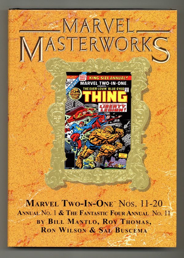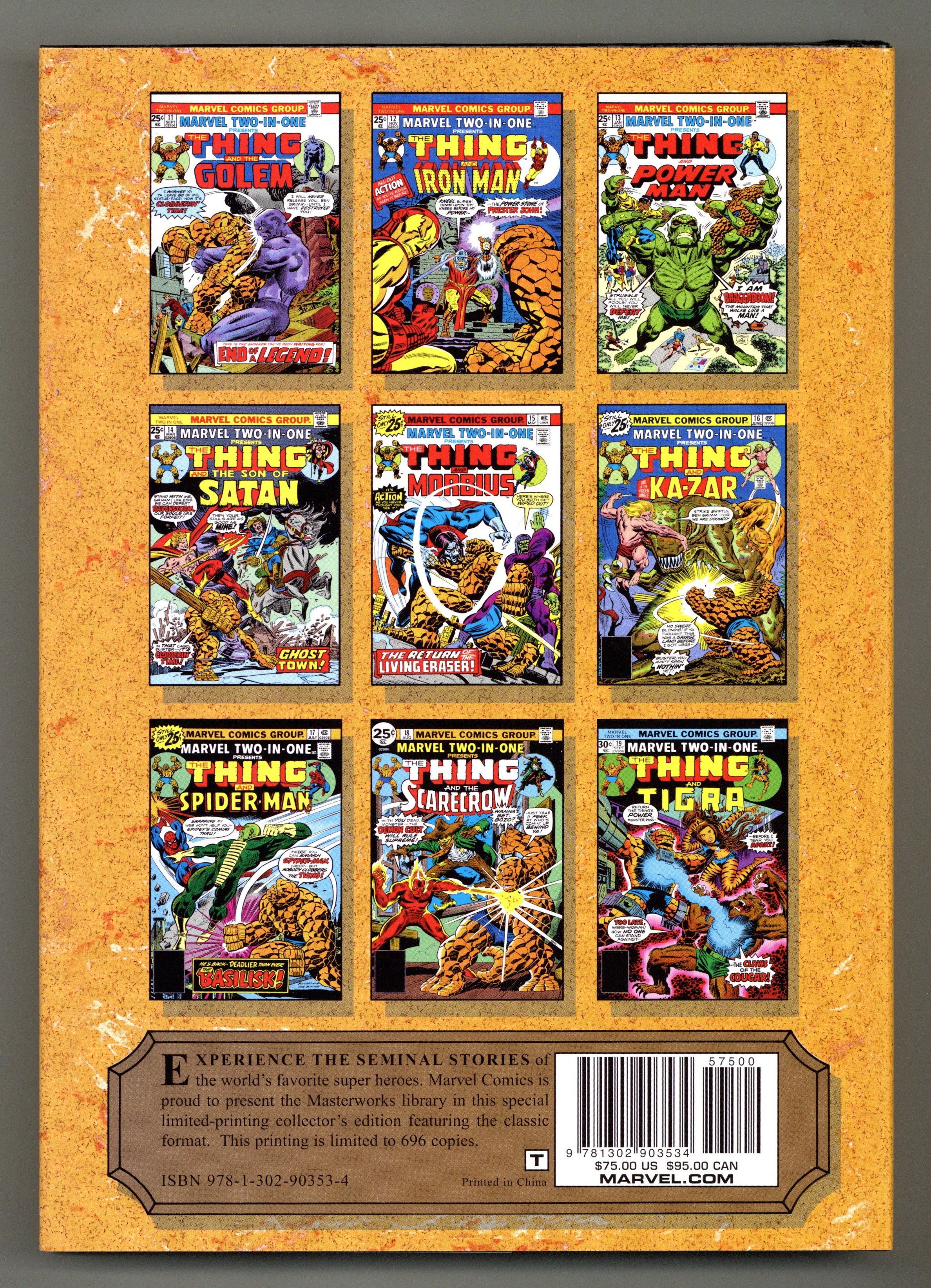 Volume 249 - 1st printing. "Marvel Two-in-One: Book 2!" Collects Marvel Two-in-One (1974-1983 1st Series) #11-20 and ANNUAL #1, Marvel Team-Up (1972-1985 1st Series) #47 and FANTASTIC FOUR ANNUAL #11. Written by Roy Thomas, Bill Mantlo, Roger Slifer, Len Wein, and Tony Isabell. Art by Bob Brown, Ron Wilson, Herb Trimpe, Arv Jones, Sal Buscema, and John Buscema. Cover by Arvell M. Jones. Whether it's heroes looking to team up or villains trying to test their mettle, everybody loves an adventure with the ever-lovin' blue-eyed Thing! And we have no doubt you'll love the adventures this volume has in store. With Luke Cage, the Thing fights the giant monster Braggadoom! With Iron Man, he encounters the mythical hero Prester John! With the Golem, Son of Satan and the Scarecrow, murderous demons are conjured! With Morbius, it's the return of the Living Eraser; with Ka-Zar, he lays a knuckle sandwich on a T. rex; with Spider-Man, it's a MTIO/MTU crossover classic - and with the FF, the Invaders and the Liberty Legion, the Thing travels back in time to World War II to battle the Third Reich! Hardcover, 288 pages, full color. NOTE: Limited to 696 copies. Cover price $75.00.