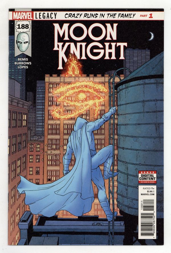 Crazy Runs in the Family: Part 1 of 6 - Written by Max Bemis. Art and Cover by Jacen Burrows. A new day is dawning and with it comes an enemy unlike any that Marc Spector, Moon Knight, has ever faced. Moon Knight has always been a protector from the shadows, but this new enemy is looking to extinguish that shadow with blinding light and fire. Get ready for the introduction of Moon Knight's greatest nemesis! PLUS: Includes 3 bonus MARVEL PRIMER PAGES! NOTE: Includes Marvel Value Stamp #24 of 53: Cable. 36 pages, full color, Rated T + Cover price $3.99.
