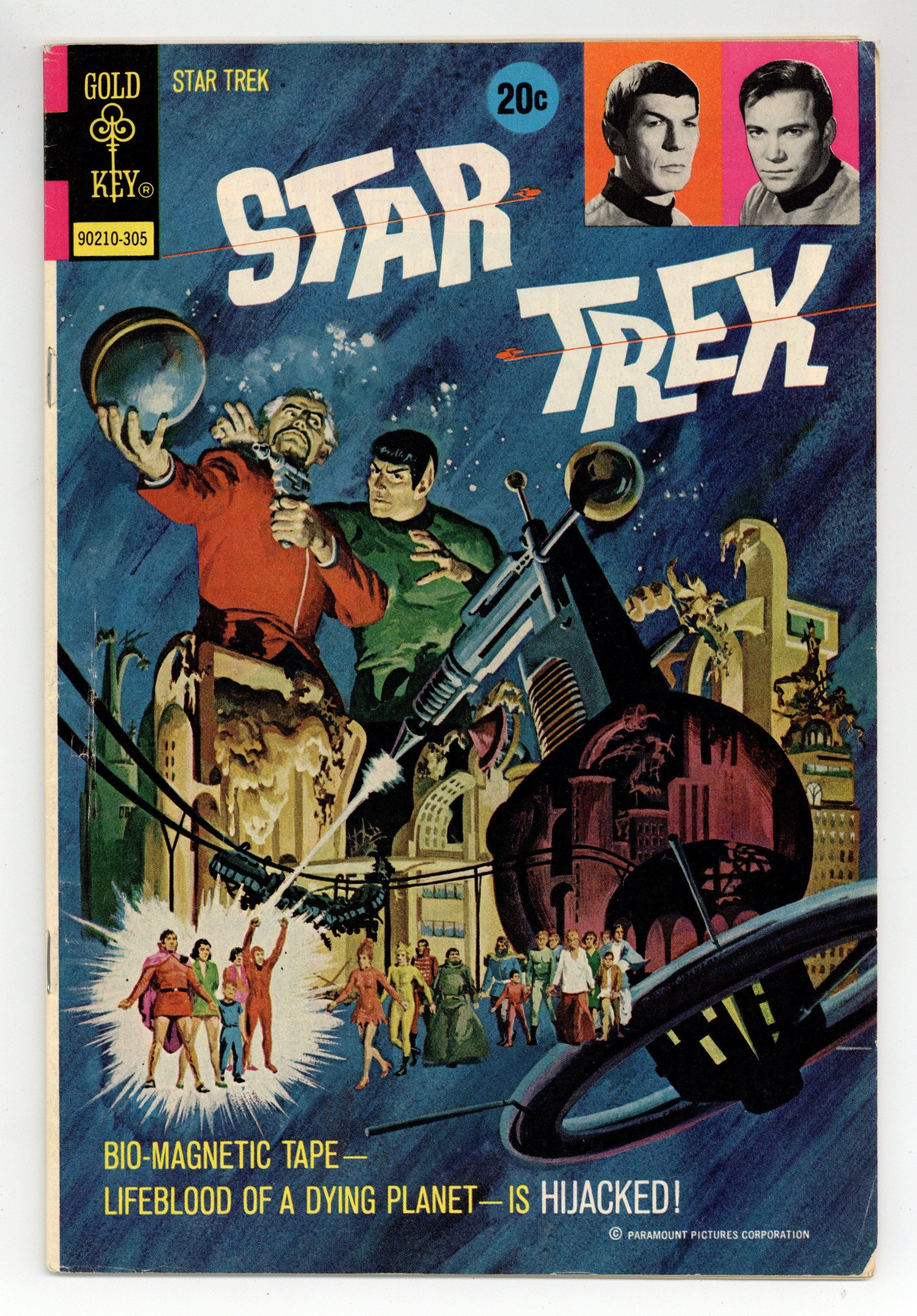 20ยข variant. Comic book version of the original Star Trek TV series that starred William Shatner and Leonard Nimoy. 10210-305. Last 15-cent cover price. Painted cover by George Wilson, with inset photos of William Shatner as Kirk and Leonard Nimoy as Spock. "The Hijacked Planet," script by Arnold Drake, art by Alberto Giolitti; bio-magnetic tape, the lifeblood of a dying planet, is hijacked, and its Spocks fault! 36 pgs., full color. Cover price $0.20.