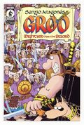 Written by Sergio Aragones and Mark Evanier. Art by Sergio Aragones. Pipil Khan wants nothing more than to name an heir and shuck his mortal coil, but one thing stands in his way: Groo! It seems Pipil Khan just can't rest easy until the world's dumbest barbarian is out of the way, and he'll give his kingdom to the one of his sons who can accomplish this. But they're gonna need help, and they just might find it in the one person tough enough to take down Groo: namely Groo! Be there as Sergio Aragonés kicks off four issues of palace intrigue, abuse of the press, and breaking stuff. 32 pages, FC. Cover price $2.95.
