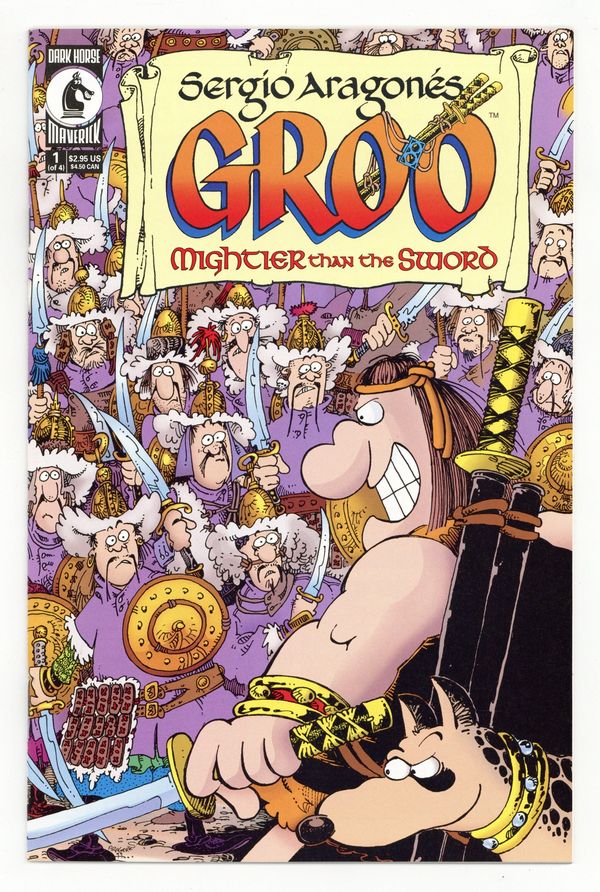 Published Jan 2000 by Dark Horse.$15.00Written by Sergio Aragones and Mark Evanier. Art by Sergio Aragones. Pipil Khan wants nothing more than to name an heir and shuck his mortal coil, but one thing stands in his way: Groo! It seems Pipil Khan just can't rest easy until the world's dumbest barbarian is out of the way, and he'll give his kingdom to the one of his sons who can accomplish this. But they're gonna need help, and they just might find it in the one person tough enough to take down Groo: namely Groo! Be there as Sergio Aragonés kicks off four issues of palace intrigue, abuse of the press, and breaking stuff. 32 pages, FC. Cover price $2.95.