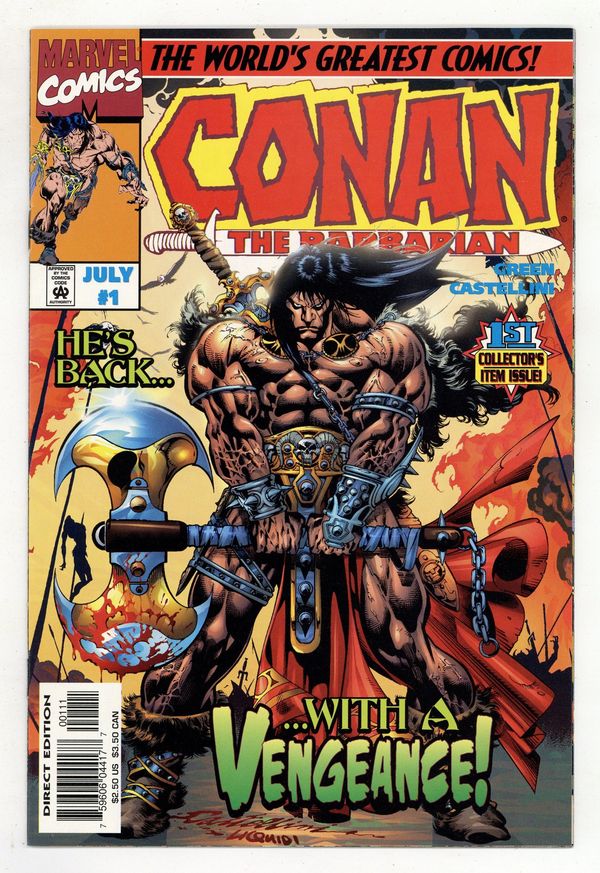 Tags: Marvel Legacy Numbering: Conan (part 276), Conan$15.50Know, that between the years when the oceans drank Atlantis and the gleaming cities, and the years of the rise of the sons of Aryas, there was an age undreamed of, when shining kingdoms lay spread across the world like blue mantles beneath the stars. Hither came Conan the Cimmerian, black-haired, sullen-eyed, sword in hand, a thief, a reaver, a slayer, with gigantic melancholies and gigantic mirth, to tread the jeweled thrones of the earth under his sandled feet. (Translation: Conan came. Conan saw. Conan kicked booty!) Written by Roland Green. Pencils and cover by Claudio Castellini. Cover price $2.50.