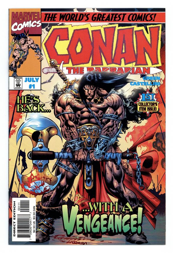 Tags: Marvel Legacy Numbering: Conan (part 276), Conan$17.00Know, that between the years when the oceans drank Atlantis and the gleaming cities, and the years of the rise of the sons of Aryas, there was an age undreamed of, when shining kingdoms lay spread across the world like blue mantles beneath the stars. Hither came Conan the Cimmerian, black-haired, sullen-eyed, sword in hand, a thief, a reaver, a slayer, with gigantic melancholies and gigantic mirth, to tread the jeweled thrones of the earth under his sandled feet. (Translation: Conan came. Conan saw. Conan kicked booty!) Written by Roland Green. Pencils and cover by Claudio Castellini. Cover price $2.50.