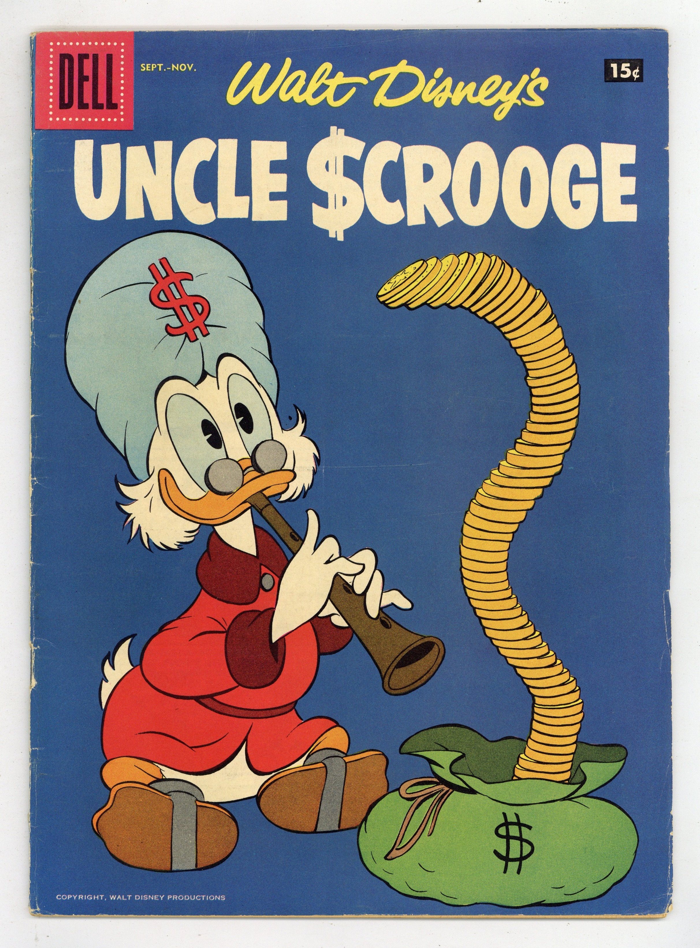 Tags: Disney Ducks & MicePublished Nov 1957 by Dell/Gold Key/Whitman.$52.0015¢ Price Variant. Cover by Carl Barks. Stories and art by Carl Barks and Tony Strobl. Comics legend Carl Barks creates his masterpiece, featuring the adventures of Donald Duck's Uncle Scrooge, the richest duck in the world. During a trip around the world, Scrooge stumbles on the Mines of King Solomon. But his nephews' Junior Woodchuck animal calls draw unwelcome attention. Gyro Gearloose is hired to build a house that's as soft as pillows. Scrooge, like George Washington, hurls a dollar across the Potomac River, but then he races in a boat across the river to catch the dollar on the other side. History Tossed; Uncle Scrooge: The Mines of King Solomon; Gyro Gearloose: Gyro Builds a Better House; Birthday Busy-ness. 32 pages, Full Color. Cover price $0.15.