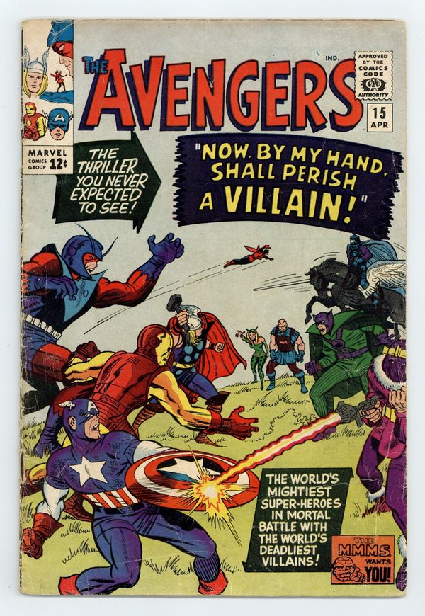 "Now, By My Hand, Shall Die a Villain!" Script by Stan Lee, layouts by Jack Kirby, pencils by Don Heck, inks by Mike Esposito (as Mickey Demeo). Avengers Roll Call: Thor, Captain America, Iron Man, Giant Man, Wasp, and Rick Jones. Villains: the first Baron Zemo, the Enchantress, the Executioner, the Melter, the second Black Knight, and the first appearance of Zemo's Mercenaries (Erik Josten). Baron Zemo is killed when a laser ray, he fires, reflects off of Captain America's shield and causes an avalanche that buries the baron underneath a ton of rock. Reprinted in Marvel Triple Action # 9. Kirby/Chic Stone cover. 36 pgs. Cover price $0.12.