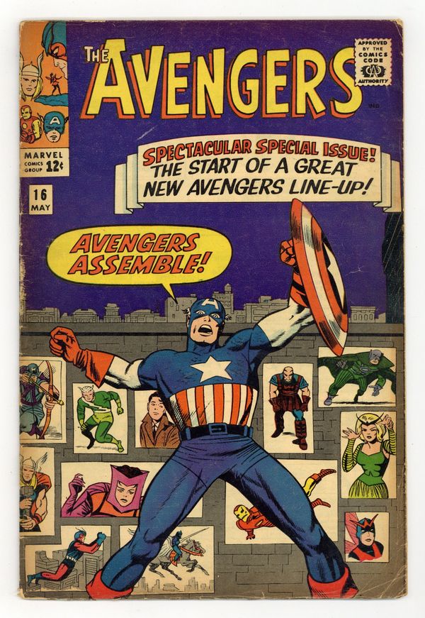"The Old Order Changeth!" Script by Stan Lee, layouts by Jack Kirby, finished art by Dick Ayers. New line-up for Avengers: Captain America, Thor, Iron Man, Wasp, Giant Man, Hawkeye, Quicksilver, Scarlet Witch, and Rick Jones. First appearance in Avengers of Edwin Jarvis, the butler (in Avengers). Villains: The Melter, the Enchantress, the Executioner, the second Black Knight, and Zemo's Mercenaries (Erik Josten). Guest Appearances by the Sub-Mariner, the Black Widow, the Mole Man, Kang, and Immortus. Cameos by Magneto, Mastermind, the Toad, Beast, Iceman, Angel (on loan from the original X-Men), and Hulk. Reprinted in Marvel Triple Action # 10. Kirby/Sol Brodsky cover. 36 pages, full color. Cover price $0.12.