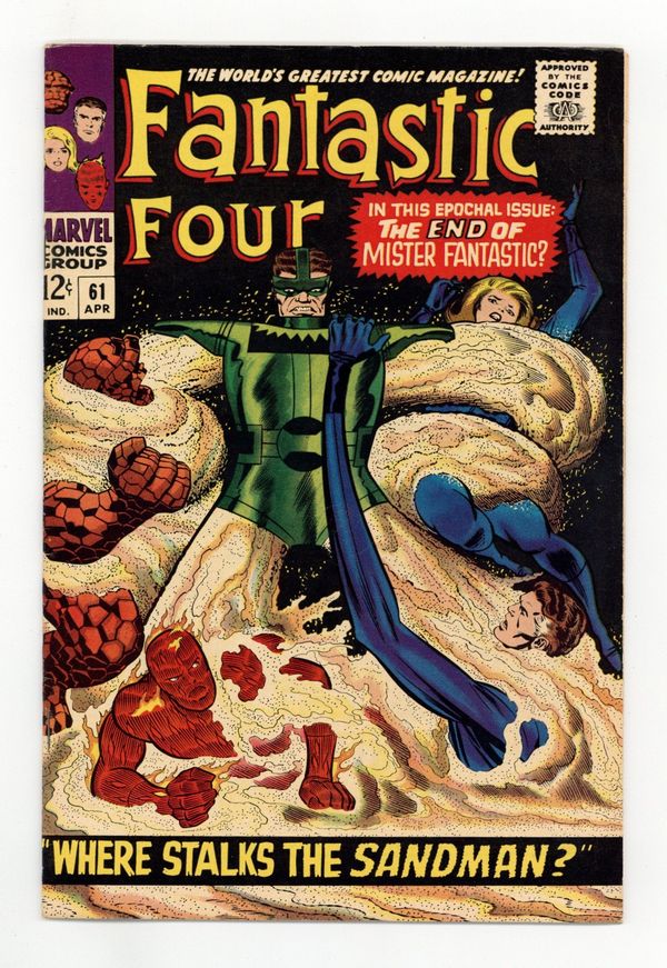 Starts Feb 9 Cover pencils by Jack Kirby, inks by Joe Sinnott. Where Stalks the Sandman?, script by Stan Lee and Jack Kirby (co-plot), pencils by Jack Kirby, inks by Joe Sinnott; The Sandman attacks the FF. During the battle, Reed is pulled into the Negative Zone and feared dead. Brief appearances by the Silver Surfer, the Inhumans, and Peter Parker. Reprinted in Marvel's Greatest Comics # 44. 36 pgs. $0.12. Cover price $0.12.
