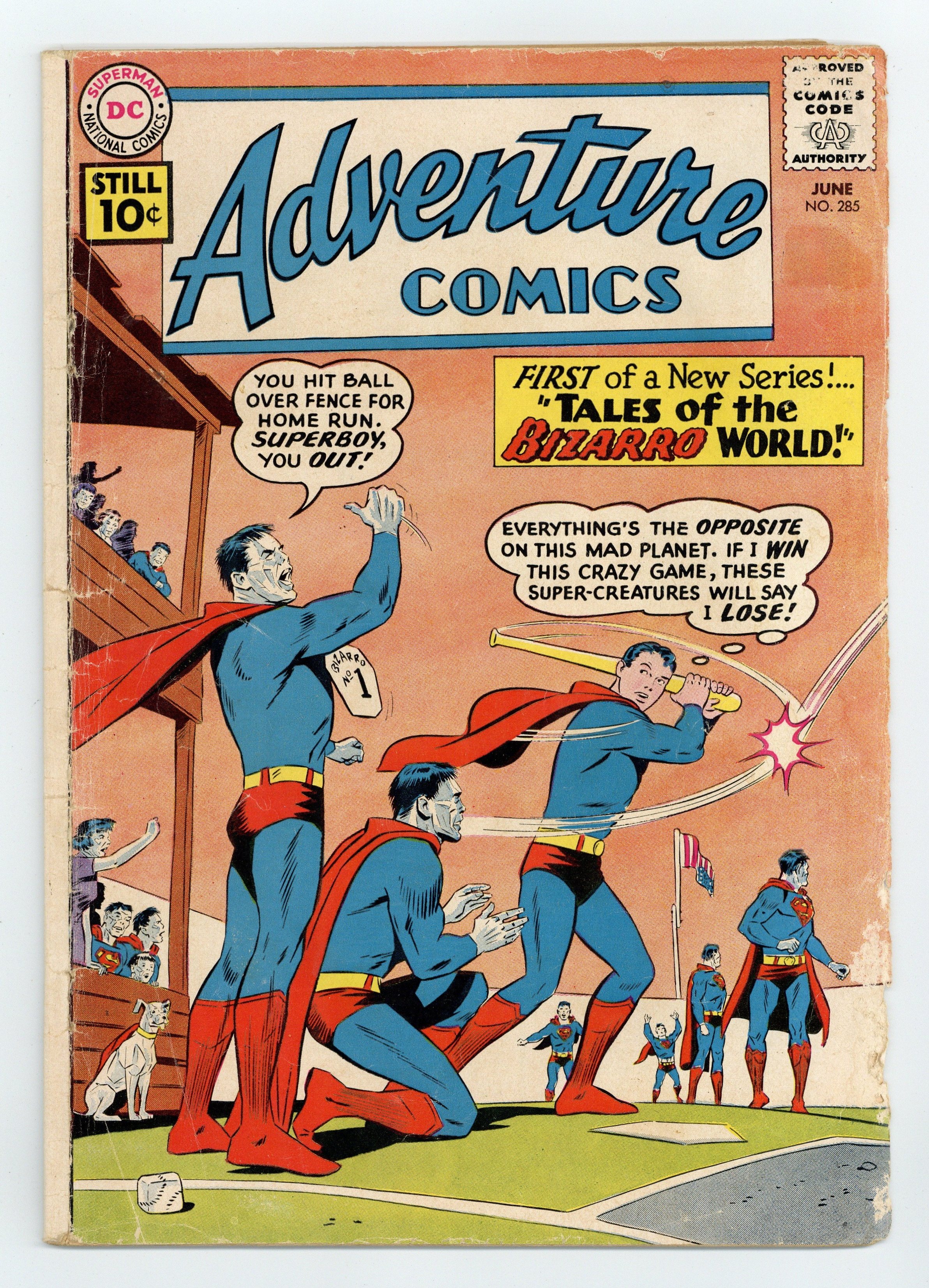 Starts May 4 Cover pencils by Curt Swan, inks by Stan Kaye. Gravity Girl of Smallville!, script by Robert Bernstein, pencils by Curt Swan, inks by Stan Kaye; Lana gets an anti-gravity belt. The Shame of the Bizarro Family!--Tales of the Bizarro World, script by Jerry Siegel, pencils by Wayne Boring, inks by Stan Kaye; Bizarro Junior No. 1 is too smart. 36 pages, Full Color. Cover price $0.10.