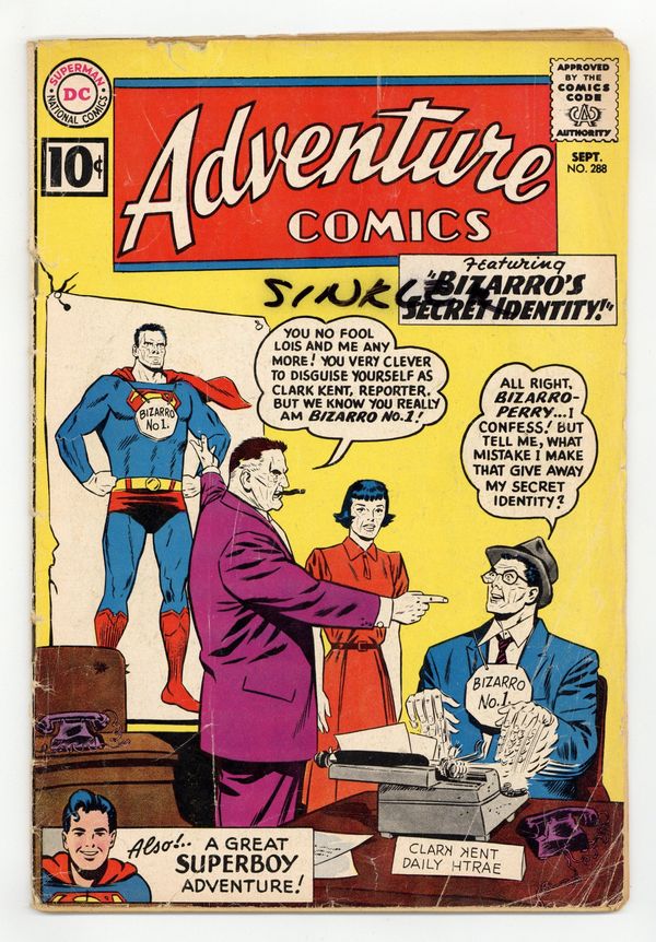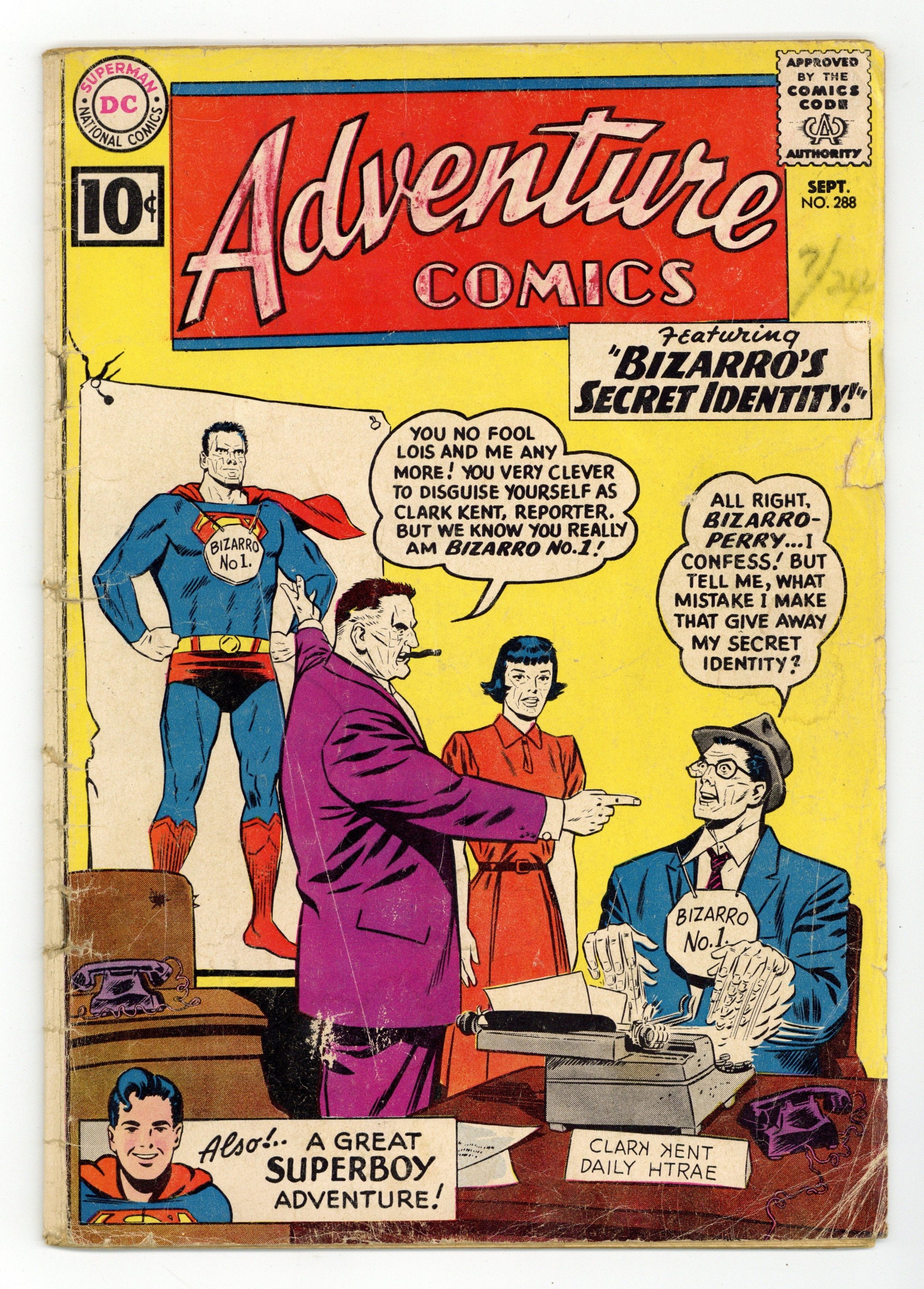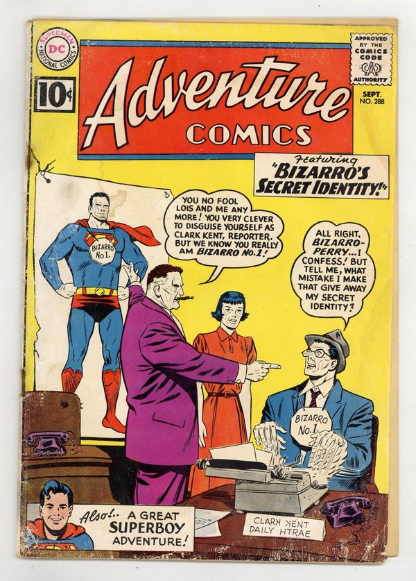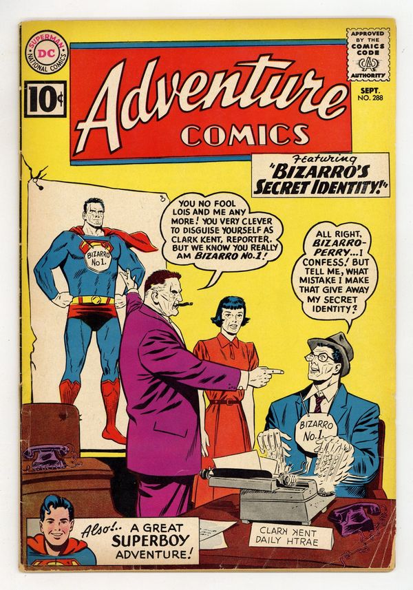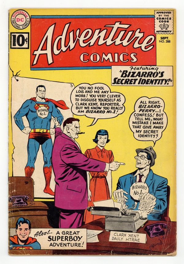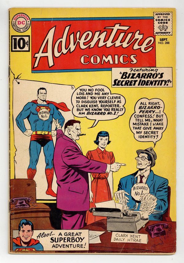 Cover pencils by Curt Swan, inks by Stan Kaye. The Knave from Krypton, script by Jerry Siegel, art by George Papp; Dev-Em puts Superboy in Phantom Zone; takes his place and destroys his reputation. Homer humor page by Henry Boltinoff. Bizzaro's Secret Identity--Tales of the Bizarro World, script by Jerry Siegel, art by John Forte; Bizarro-Kyltpyzxm gives Bizarro Lois super powers and she adopts a secret identity. 36 pages, Full Color. Cover price $0.10.