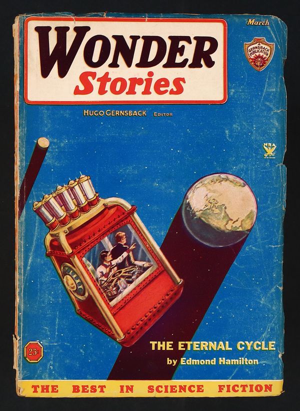 "In the Caverns Below" 1/3 a serial by Stanton A. Coblentnz, plus two short stories, "The Eternal Cycle" by Edmond Hamilton, and "Pigments is Pigments" by Mortimer Weisinger,later to become senior editor at DC comics!
