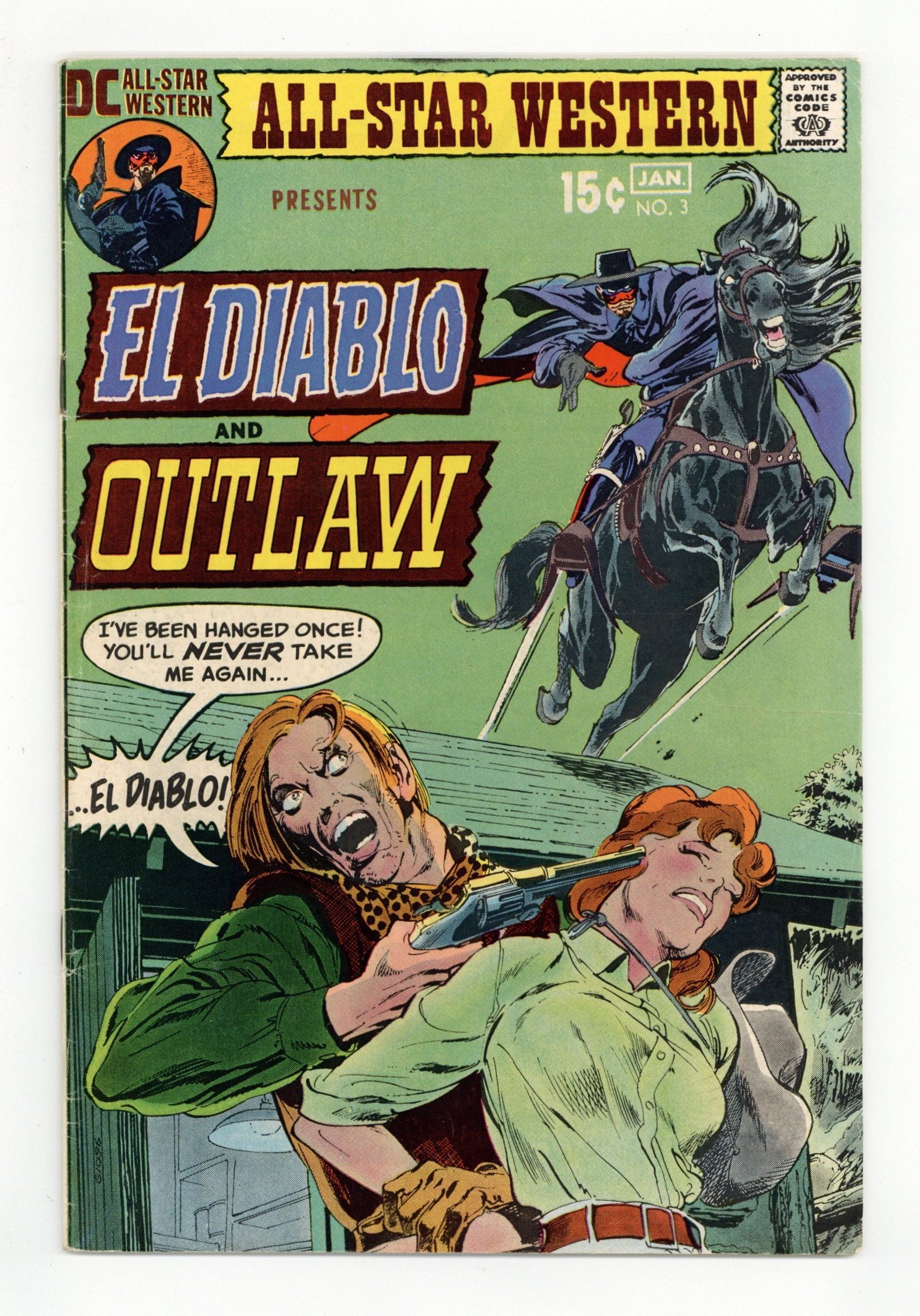 Cover art by Neal Adams. "Death Deals the Cards!", script by Robert Kanigher, art by Gil Kane; With his father still hot on his trail, Rick Wilson joins up with Dix, a train robber who has targeted a train which Rick's father is traveling on; However, when Dix plans on killing Rick as well, not being able to trust the son of a Texas Ranger; However Rick with the help of his hawk manages to turn the tide on Dix and shoots him and his men dead. "And the Sun Beat On" text story by Mike Friedrich. "Call Him Satan - Call Him Saint!", script by Robert Kanigher, art by Gray Morrow; El Diablo helps to save an old gold miner who is mining to financially help out a widowed lady, from being a robbery victim and possibly death; His bigger mission, as it turns out, is the gang behind this attempted robbery: the Hooded Man's Gang. 36 pgs., full color. Cover price $0.15.