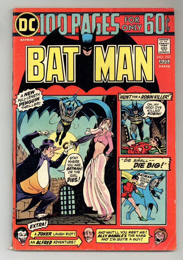 100-page giant. Cover by Nick Cardy. "Hail Emperor Penguin!", script by Denny O'Neil, pencils by Irv Novick, inks by Dick Giordano; When a young King is kidnapped by the Penguin, it takes the efforts of Batman, Robin and Talia to free him from the madman's clutches. The Penguin's Unique Umbrellas! panels from previous comics. "Hunt for a Robin-Killer!", script by Gardner F. Fox, art by Gil Kane; After finding the Boy Wonder nearly dead from a brutal beating, a vengeful Batman hits the streets to find the man responsible. One-page Casey the Cop story by Henry Boltinoff. "Ally Babble and the Fourteen Peeves!", script by Bill Finger, art by Dick Sprang; Ally Babble accepts the offer of $5000 from a rich man to eliminate 14 peeves he has against others, but is soon charged with ripping off the man who paid him. "Conversational Clue!", script by Mort Weisinger, art by Jerry Robinson; When Alfred accidently hears some unsettling conversation in a local library, he follows the clue up...which nearly costs him his life! "Die Small--Die Big!", script by Robert Kanigher, pencils by Bob Brown, inks by Joe Giella; The appearance of a man dressed as the Batman at a party at Wayne Mansion and carrying a death threat for the Caped Crusader spurs Batman to attack the problem alone without the aid of Robin. "Rackety-Rax Racket!", script by Don Cameron, art by Dick Sprang (as Bob Kane); A series of crazy college initiations are actually a blind for daring thefts masterminded by the Joker! 100 Pages, Full Color. Cover price $0.60.
