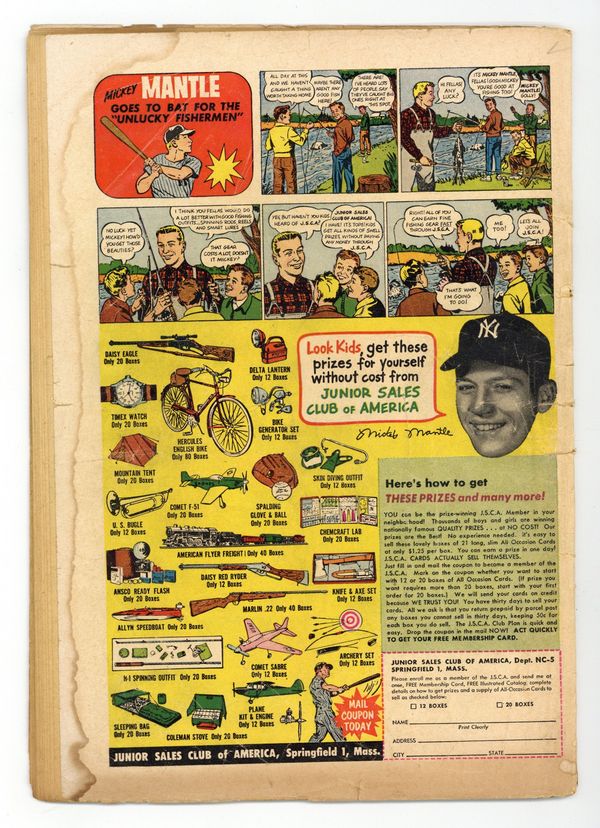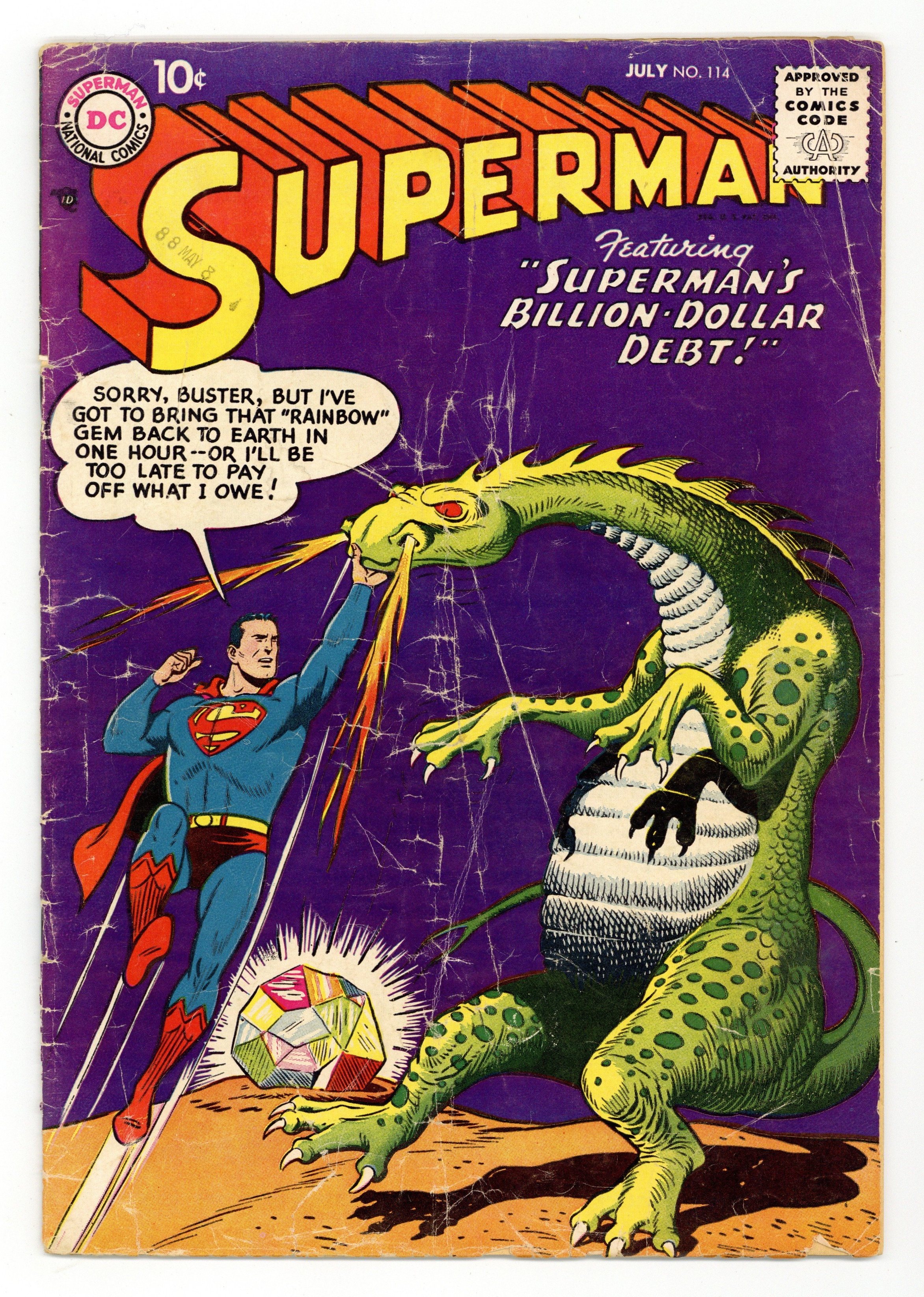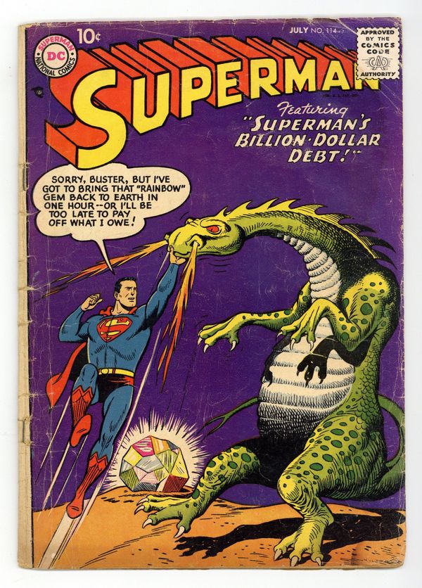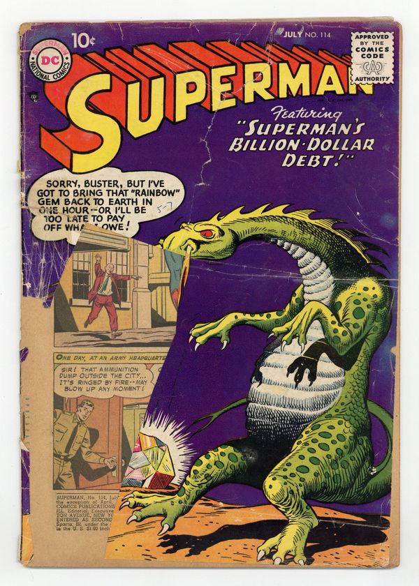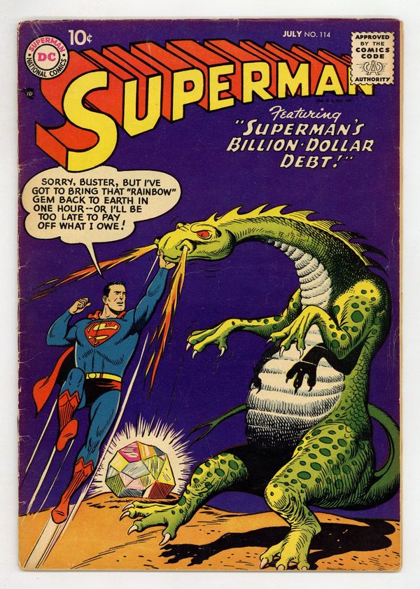 Cover art by Al Plastino. The Soundproof Superman, script by Jerry Coleman, pencils by Wayne Boring, inks by Stan Kaye. The Man Who Discovered Superman's Identity starring Superman and Mento, script by Otto Binder, art by Al Plastino. Superman's Billion-Dollar Debt starring Superman and Jason Hawker, script by Otto Binder, pencils by Wayne Boring, inks by Stan Kaye; Superman battles an alien dragon in order to procure a valuable gem. 36 Pages, Full Color. Cover price $0.10.