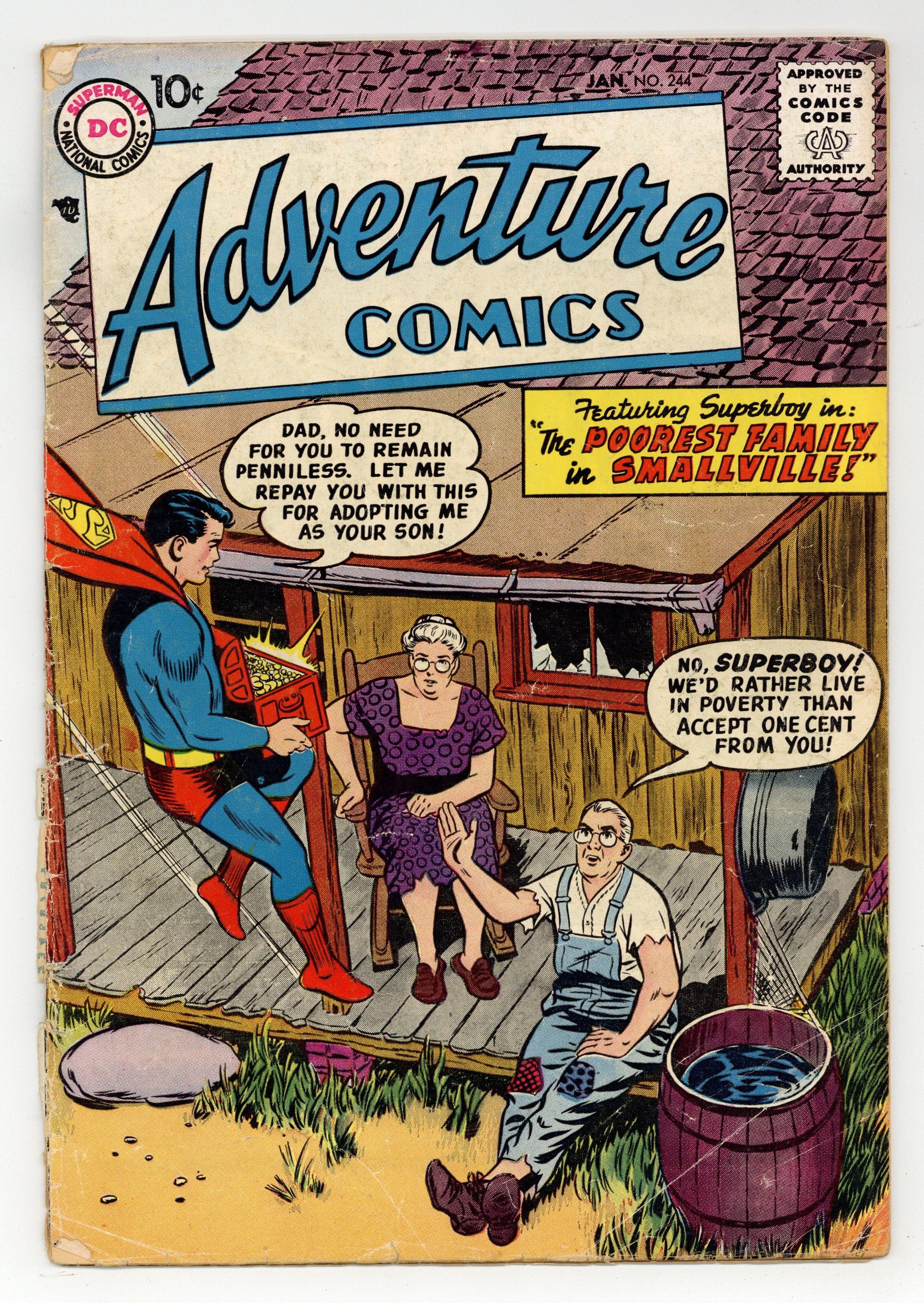 Cover pencils by Curt Swan, inks by Stan Kaye. The Poorest Family in Smallville starring Superboy, script by Alvin Schwartz, art by John Sikela; Ma and Pa Kent are poverty stricken. Ad for Sgt. Bilko, Bob Hope, Jerry Lewis, and Jackie Gleason. Little Pete humor page by Henry Boltinoff. Mysteries in Space fact page by Mort Drucker. A Medal for Roy starring Green Arrow, script by George Kashdan, art by George Papp. Jerry Jitterbug humor page by Henry Boltinoff. The Copy Cat Creature starring Aquaman, script by Robert Bernstein, art by Ramona Fradon. 36 pages, Full Color. Cover price $0.10.