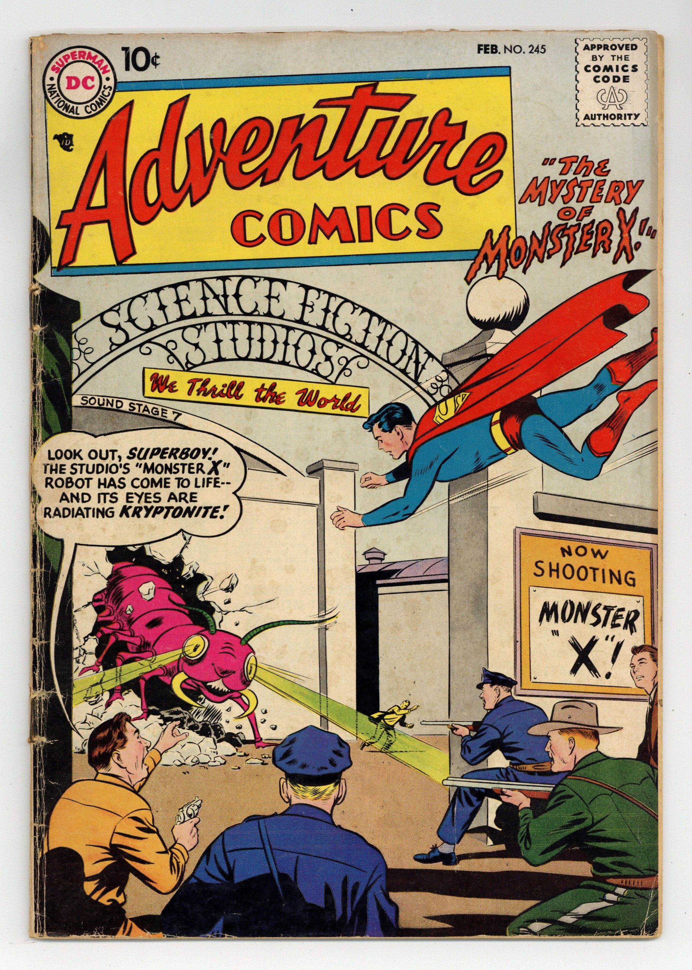 Cover pencils by Curt Swan, inks by Stan Kaye. The Mystery of Monster X starring Superboy, script by Otto Binder, art by Al Plastino; a movie studios monster comes to live and radiates Kryptonite out of its eyes. Ad for Mystery in Space and Strange Adventures, pencils by Gil Kane, inks by Bernard Sachs. The Big Surprise Arrows starring Green Arrow, art by George Papp. Varsity Vic humor two-pager by Henry Boltinoff. The Sorcerer of the Sea, script by George Kashdan, art by Ramona Fradon; when sorcerer Jason Deeter appears to be able to control Aquaman, maritime hijackers try to use Deeter to force Aquaman to help them commit crimes. 36 pages, Full Color. Cover price $0.10.