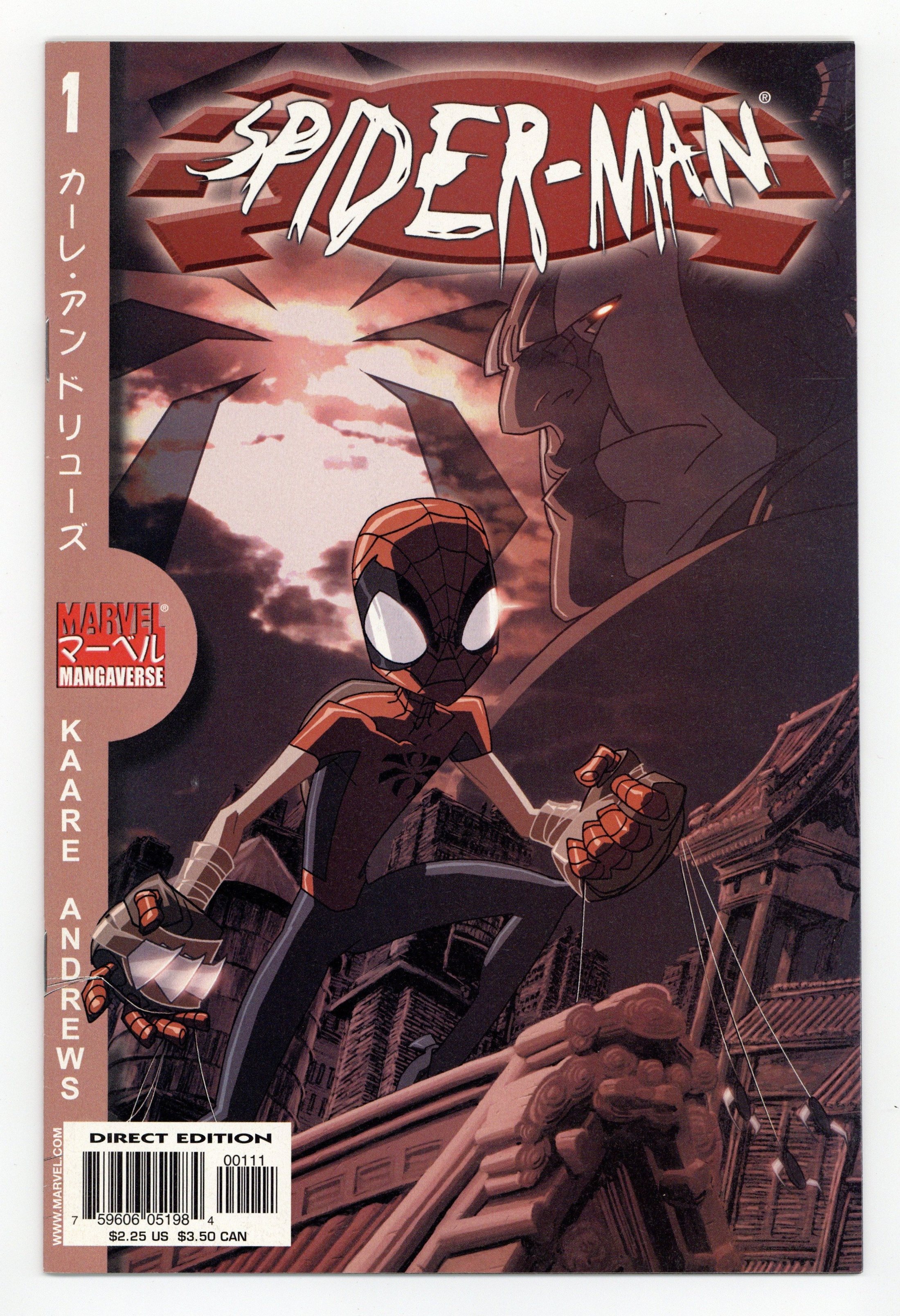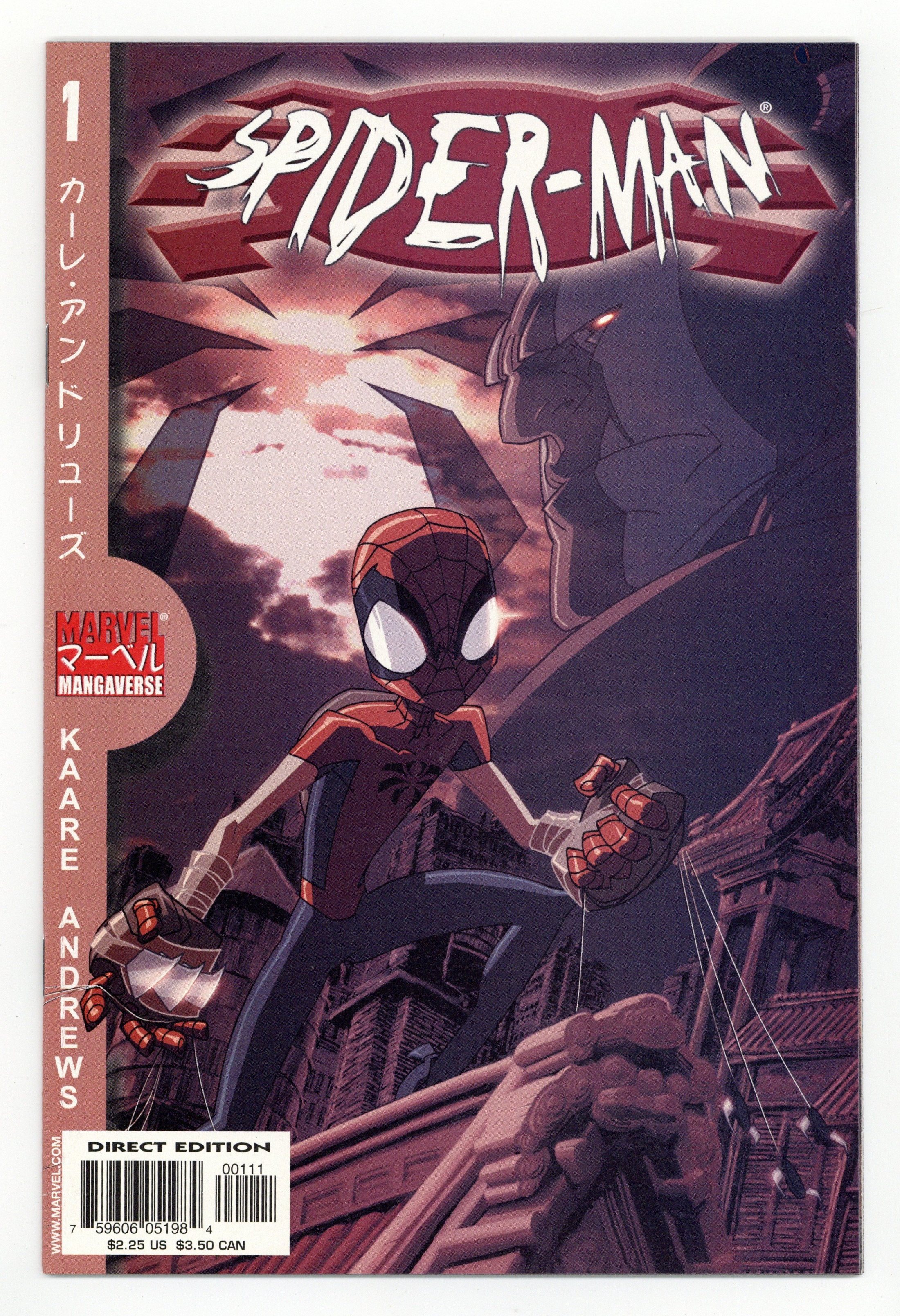 Tags: Manga, Spider-Man$14.00cover by kaare andrews kaare andrews (w & p) ? THE SCOOP: It's non-stop ninja action in the Manic Mangaverse Manner! ? THE STORY: Teenage ninja Peter Parker has had to deal with a lot of stress in his life, but nothing could have possibly prepared him for this ? his most trying test to date! Will the training he received from Uncle Ben be enough to avenge his Sensei's death? ? THE CREATORS: Written and penciled by AMAZING SPIDER-MAN cover artist, Kaare Andrews (Gen 13)! ? THE FORMAT: 32 pages, with ads. 7-59606-tbd-00111 2.25 Cover price $2.25.