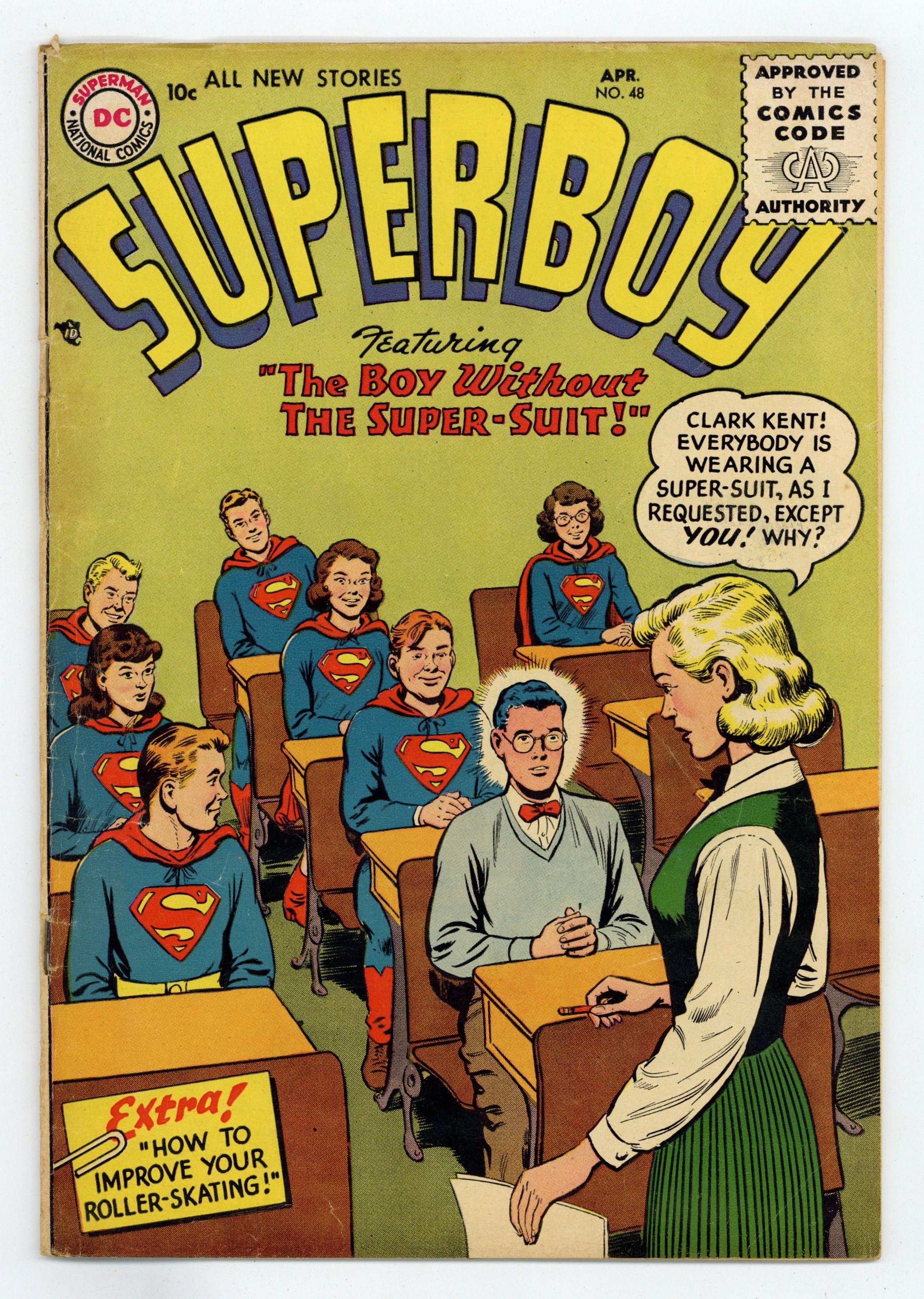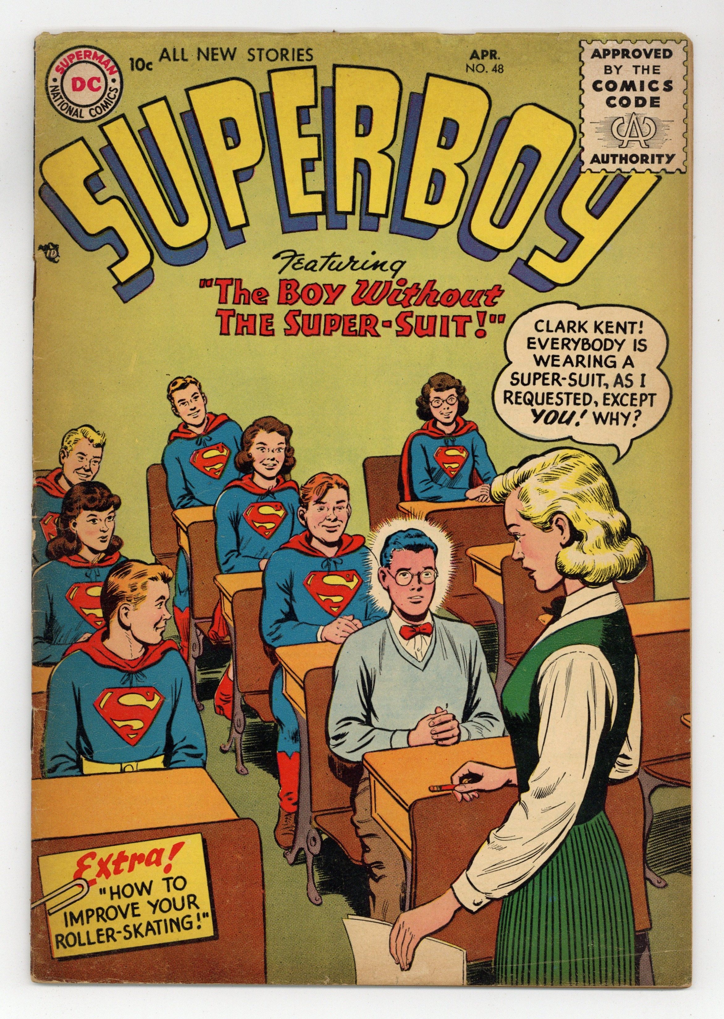 Cover pencils by Curt Swan, inks by Ray Burnley. Dad Kent's Delusions, script by Otto Binder, pencils by Curt Swan, inks by Stan Kaye; After an accident Pa forgets that Clark is Superboy and is convinced Superboy is impersonating his missing son. Varsity Vic humor page by Henry Boltinoff. Lana Lang's Super Powers!, script by Jerry Coleman, art by John Sikela; Superboy must convince Lana that Martians have given her, Alvin, and Clark super powers. Shorty humor page by Henry Boltinoff. How to Improve Your Roller Skating article by Jack Miller [as John MacKenzie]. The Boy without a Super-Suit, script by Jerry Coleman, pencils by Curt Swan, inks by Stan Kaye; When Superboy is out of town, the people set up an elaborate scheme that requires all kids, except Clark, to dress in Superboy costumes. 36 Pages, Full Color. Cover price $0.10.