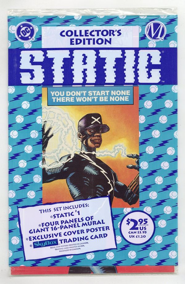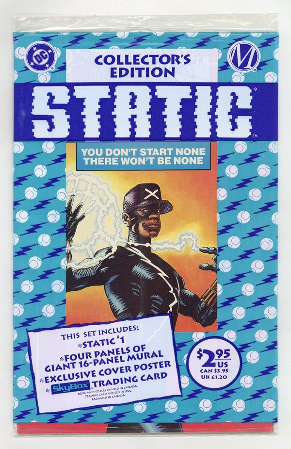 Direct Edition polybagged with: 1)Four panels of Giant 16-panel mural; 2) Exclusive cover poster; and 3) a Skybox trading card. Cover by Denys Cowan and Jimmy Palmiotti. Burning Sensation [Trial by Fire, Chapter One], script by Dwayne McDuffie and Robert L. Washington III, art by John Paul Leon and Steve Mitchell; Frieda goes to Akkad's place where the five alarm crew is waiting to take her somewhere; Static steps in and defeats them; Frieda goes home; Virgil asks Larry about asking Frieda out; Larry says he thinks Frieda believes they're just friends; the five alarm crew take Frieda to Hot-Streak; Static battles Hot-Streak, but when he sees his face he stops fighting and is defeated en by him. 36 pgs., full color. $2.95. Cover price $2.95.
