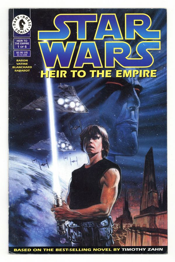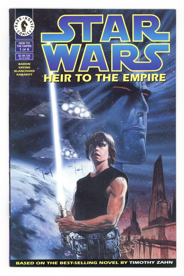 Direct Edition. Written by Mike Baron. Art by Olivier Vatine and Fred Blanchard. Cover by Mathieu Lauffray. The tyranny has ended. But what will take its place? It is now five years after Return of the Jedi. Leia and Han are married and have shouldered heavy burdens in the government of the New Republic. And Luke Skywalker is the first in a hoped-for new line of Jedi Knights. But thousands of light-years away, the last of the Emperor's warlords, Grand Admiral Thrawn, has taken command of the remains of the Imperial fleet. Thrawn has made two vital discoveries that could destroy the Rebel Alliance's New Republic. The tale that emerges is a towering epic of action, invention, mystery, and a spectacle of galactic scale -- in short, a story that is worthy of the name Star Wars. 32 pages, FC. Cover price $2.95.
