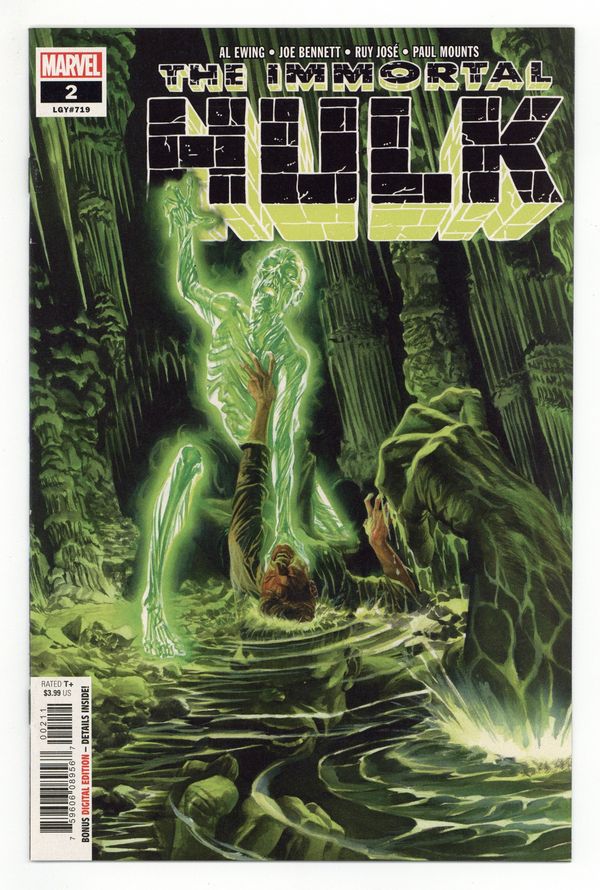 Tags: Marvel Legacy Numbering: Hulk (part 719), Hulk$26.00Written by Al Ewing. Art by Joe Bennett. Cover by Alex Ross. A random small-town tragedy. A mystery illness that spreads with grief. A green glow on a lonely mountain. Three puzzle pieces that fit together to make a nightmare. And the only mind on Earth than can connect them up…belongs to the Immortal Hulk. 28 pages, full color. Rated T+ Cover price $3.99.