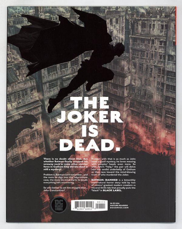 Written by Brian Azzarello. Art and Cover by Lee Bermejo. DC BLACK LABEL, the highly anticipated new imprint from DC Comics, starts here! The Joker is dead. There is no doubt about that. But whether Batman finally snapped his scrawny neck or some other sinister force in Gotham City did the deed is still a mystery. Problem is, Batman can't remember… and the more he digs into this labyrinthine case, the more his mind starts to doubt everything he's uncovering. So who better to set him straight than… John Constantine? Problem with that is as much as John loves a good mystery, he loves messing with people's heads even more. So with John's 'help,' the pair will delve into the sordid underbelly of Gotham as they race toward the mind-blowing truth of who murdered The Joker. BATMAN: DAMNED is a bimonthly super-natural horror story told by two of comics' greatest modern creators-a visceral thrill-ride that proudly puts the 'black' in BLACK LABEL. 48 pages, full color. Mature Readers Cover price $6.99.