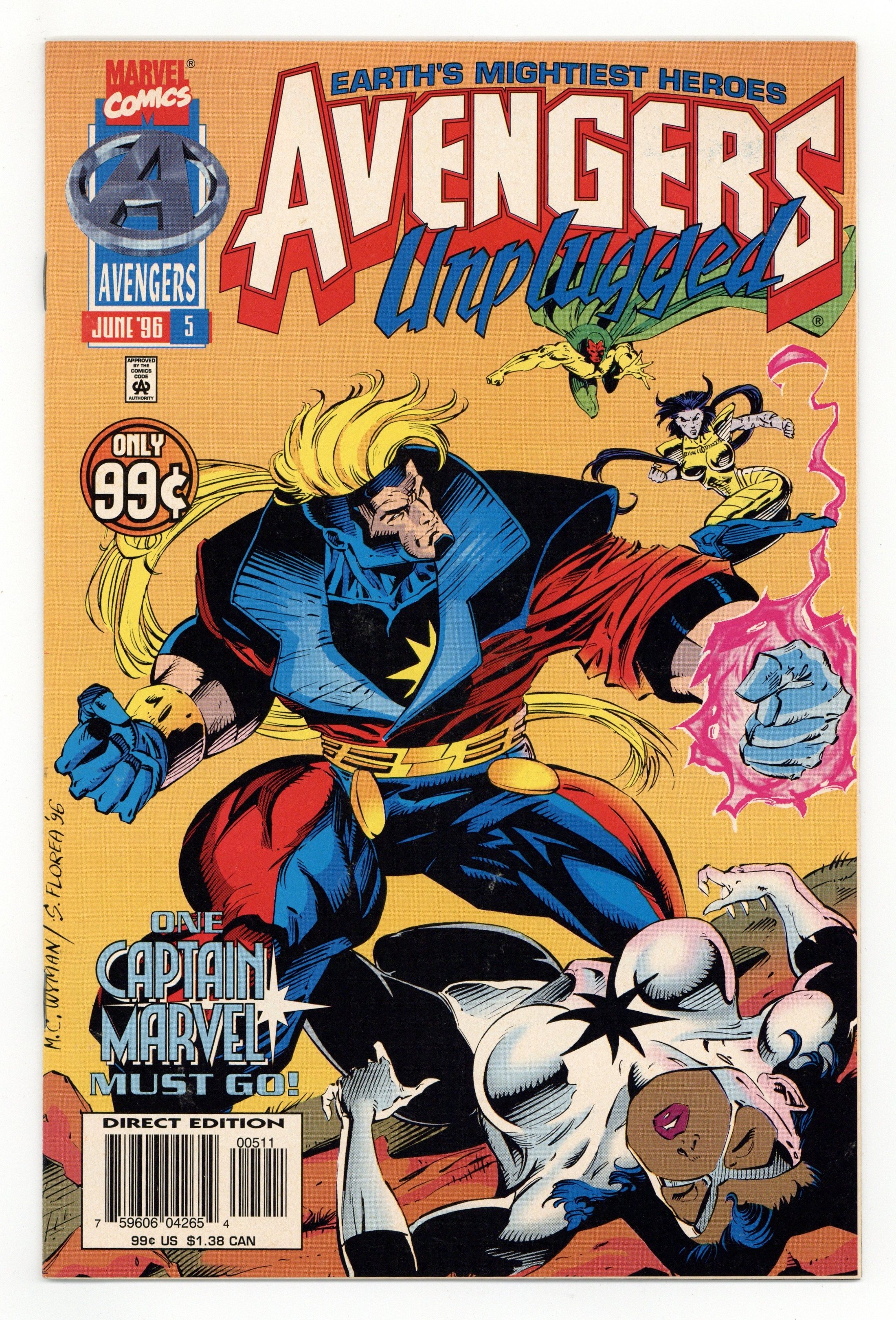 "Legacies" Script by Glenn Herdling. Pencils by M.C. Wyman. Inks by Sandu Florea and Tom Palmer. Cover by M.C. Wyman and Sandu Florea. Captain Marvel (aka Monica Rambeau) falls under the control of the Controller! And the diabolical super-villain commands her to capture the son of the first Captain Marvel! To that end the former avenger zooms to Titan and ambushes Starfox and Legacy (aka Genis-vell)! When Monica returns to Earth with Legacy, the battle of (captain) marvels begins! Will the Controller get his long-awaited revenge? Or will the Avengers take control before it's too late? Avengers Lineup: Captain Marvel, Deathcry, Starfox, and the Vision. (Notes: This is the best issue of the short Avengers Unplugged series. The Controller's history with the first Captain Marvel goes back to the classic Captain Marvel (1st series) issues 28-30. The splash page includes brief biographies of Starfox, Deathcry, and the Vision. Monica Rambeau changes her superhero name to Photon. This issue was also published as the 'flip book' to Untold Tales of Spider-Man 10.) 32 pages. Cover price $0.99.