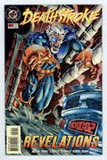 Crimelord/Syndicate War: Part 4 of 4. "Revelations!" Part 4 of 4. Guest-starring the New Teen Titans, the Outsiders, Hawkman, Extreme Justice, Steel, Checkmate, Deadshot, the Blood Pack, Vigilante, and Sargent Steel. Story by Marv Wolfman and Dale Herbik. Art by Sergio & Octavio Cariello, Keith Champagne, Ron McCain, and Will Blyberg. It's the explosive conclusion to the Crimelord/Syndicate War! With the world on the verge of a nuclear disaster, Deathstroke finally comes face-to-face with the sinister adversary that has been dogging him for the past several months. Plus, Ravager makes a startling and deadly return, and he has a few surprises of his own. Slade and Ravager's tale continues in Deathstroke Annual #4. Includes three pin-ups: Deathstroke by Paul Gulacy, Vigilante by S. Clarke Hawbaker, and Deathstroke vs. Vigilante by Alex Morrissey. 48 pages. Cover price $3.50.