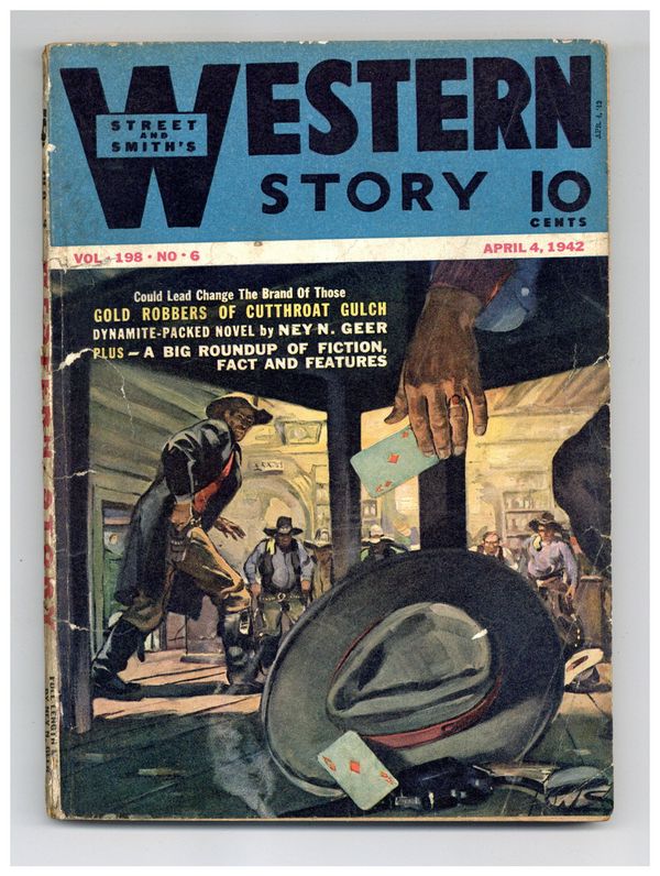 Vol. 198, No. 6. April 4, 1942. Includes: "Gold Robbers of Cutthroat Gulch" by Ney N. Geer; "Gunsmoke Masquerade" by Peter Dawson; "3 Headaches, 8 Horses - and No Wagon!" by Glenn H. Wichman; "Nemesis of the Northland" by Jim Kjelgaard; "Man-Size Medico" by L. P. Holmes; "Range Savvy" by Carl Raht; and "Wahoo of the Wagon" by S. Omar Barker. 6.75" x 9.25". 130 pages. Text with occasional illustrations. Black and white. Cover price $0.10.