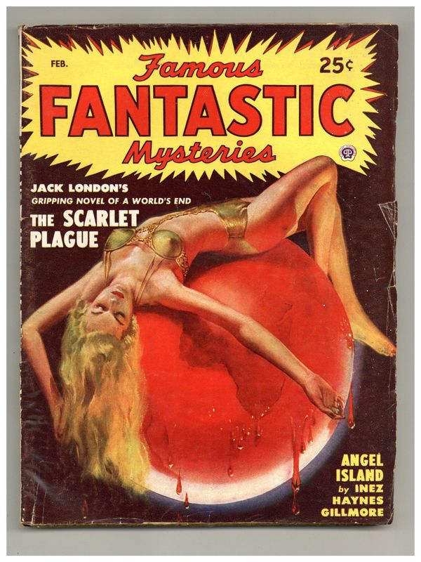 Volume 10, Issue 3 - February, 1949. Cover by Lawrence Stevens. Stories by Inez Haynes Gillmore and Jack London. Illustrations by Lawrence Stevens and Leydenfrost. Book-length novel: "Angel Island" by Inez Haynes Gillmore - Five desperate, earthbound men...an isle where Love and Death were neighbors...a day when wings fought free of fetters to make a strange new world. Novelette: "The Scarlet Plague" by Jack London - Across a sick world it had crept, leaving man and his works destroyed. Now, in the twilight of history, only one remembered -- a blurred and faded picture of the death of our times. Also: The Readers' Viewpoint; In the Next Issue; Masters of Fantasy by Neil Austin - M.P. Shiel, High Priest of Phantasy; and The Lawrence Portfolio. 7-in. x 9 1/2-in., 130 newsprint pages, B&W. Published by Popular Publications Cover price $0.25.