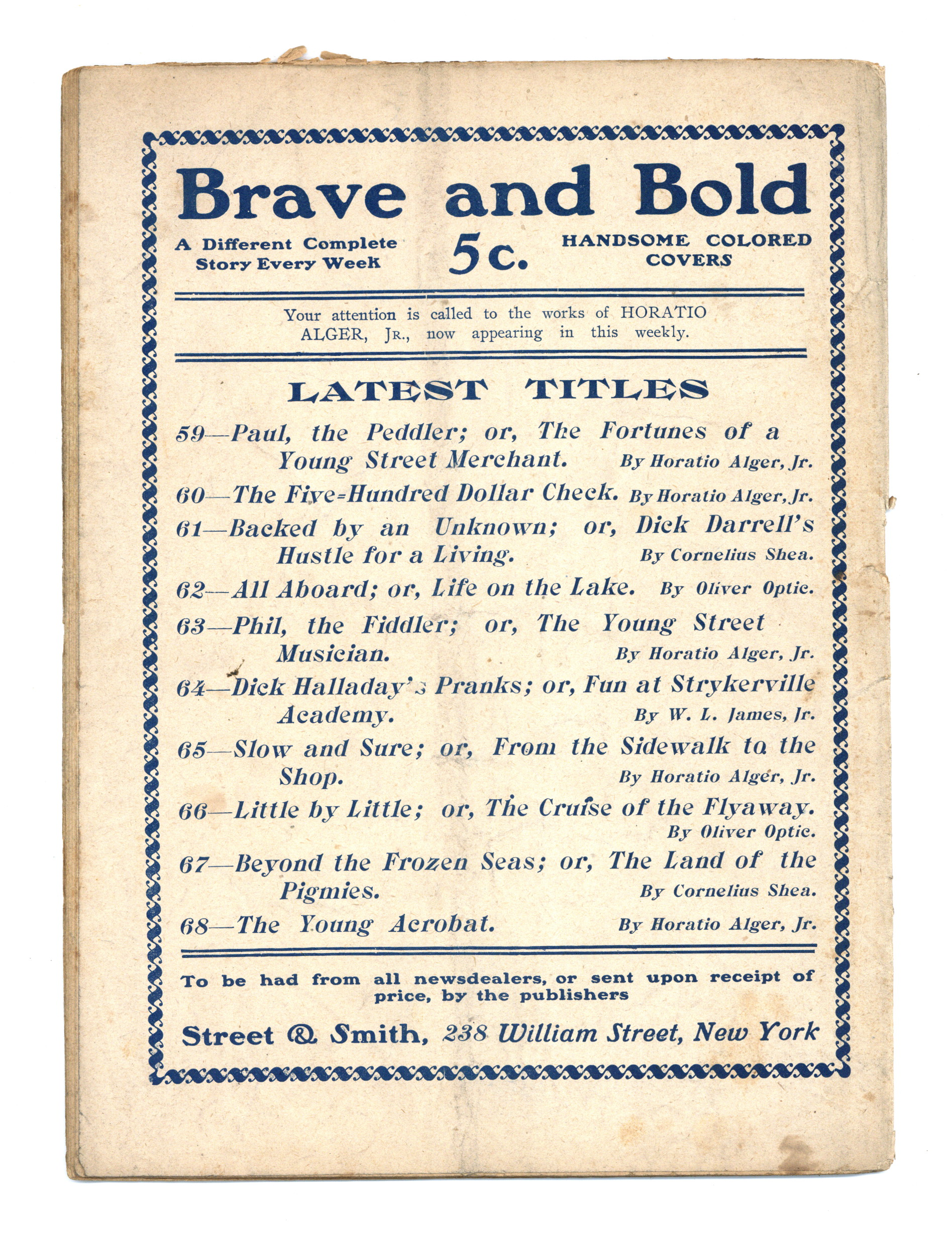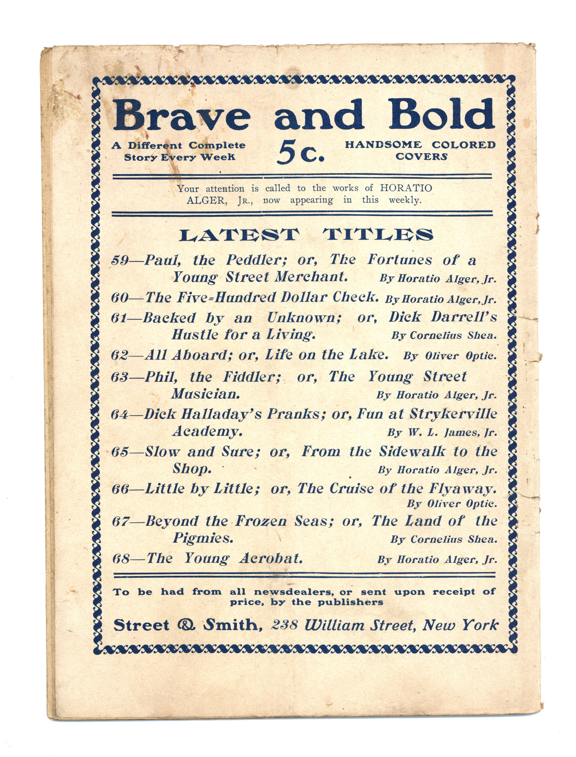 Published May 1904 by Street & Smith.$10.00- Spine split 5%. Staple rust: Slight.