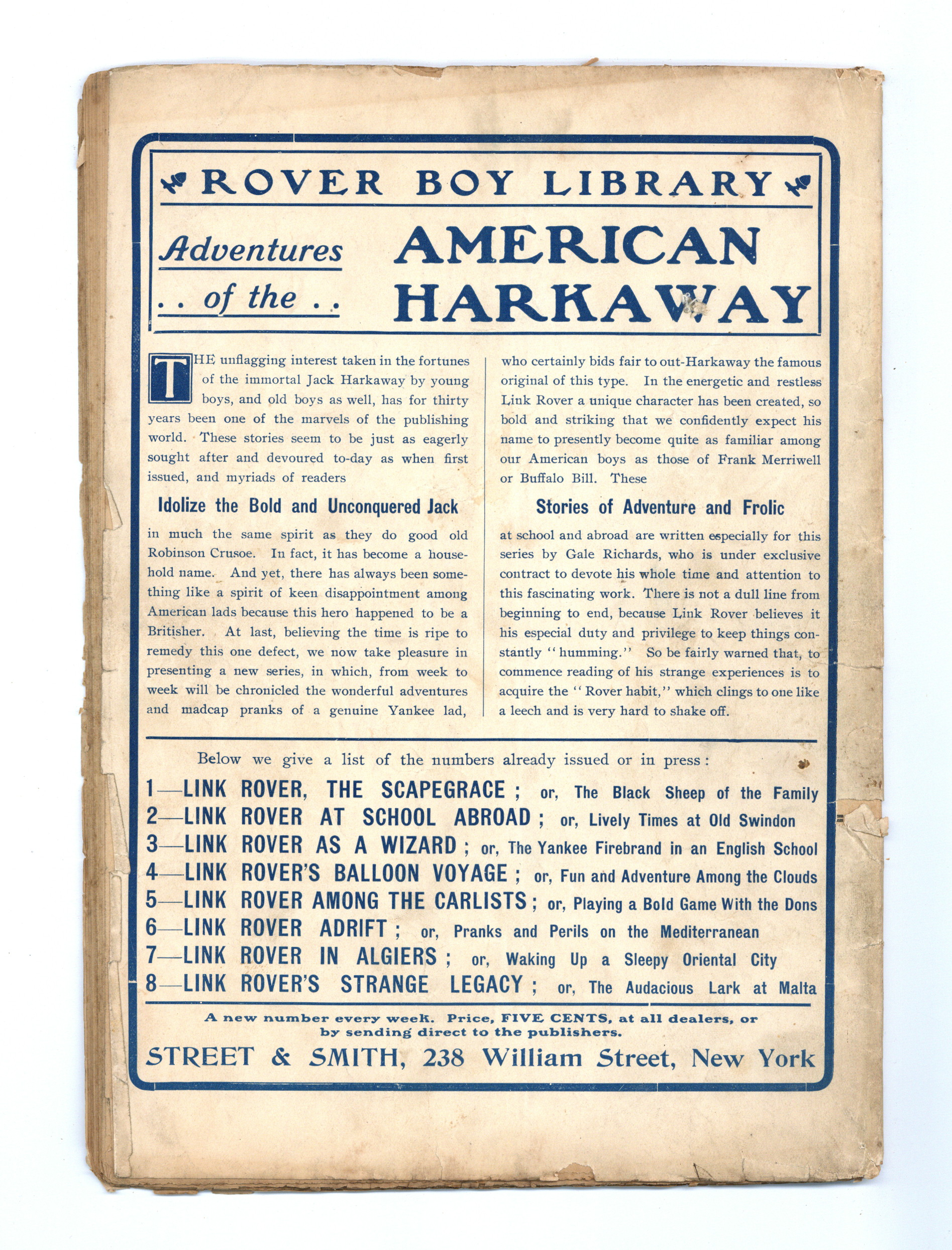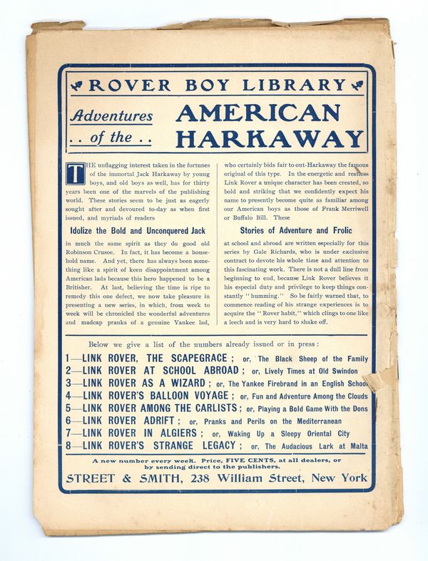 Published Sep 1904 by Street & Smith.$10.00- Water damage: Moderate. Staple rust: Slight.
