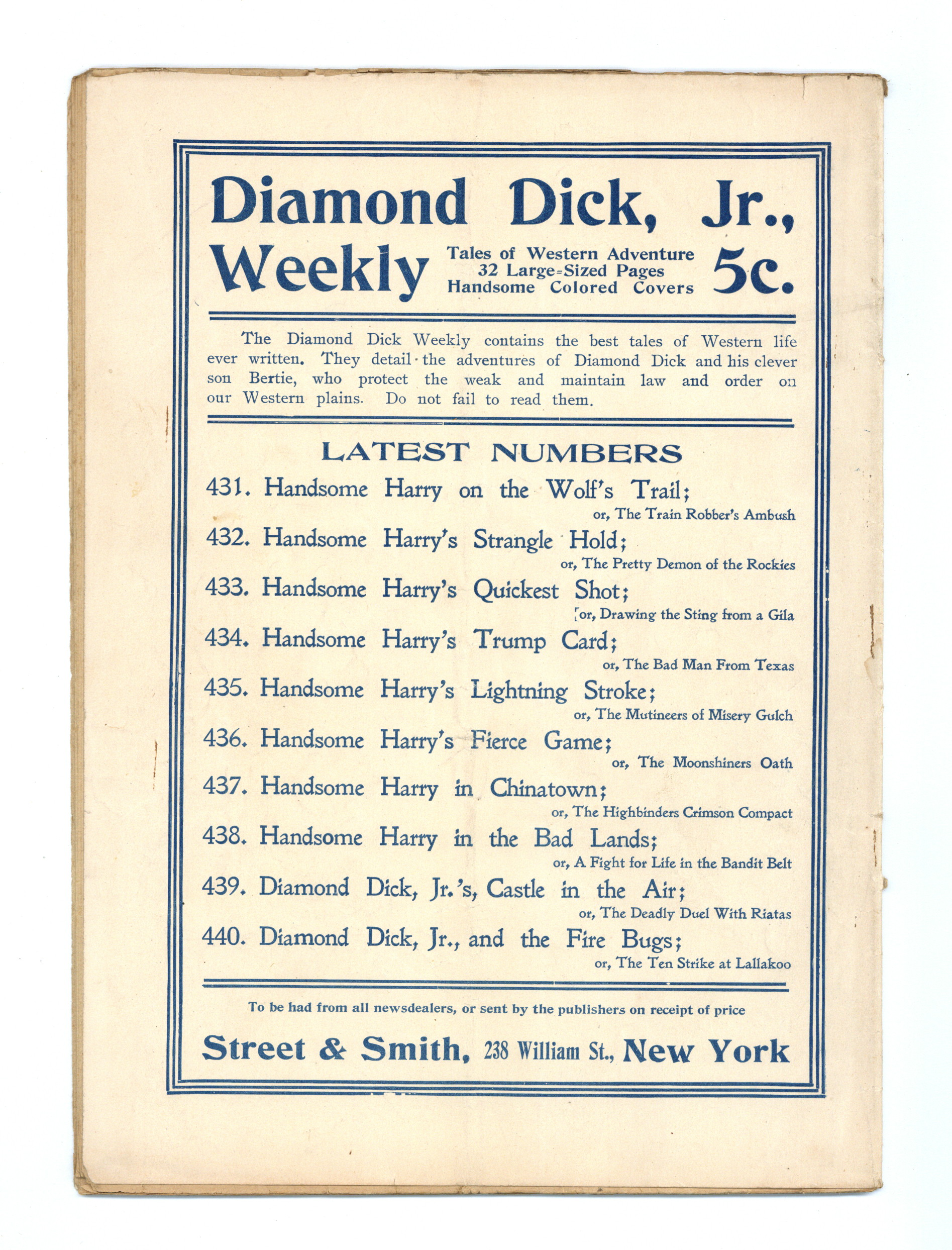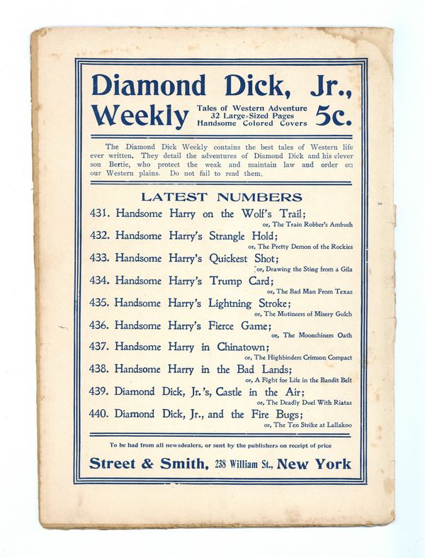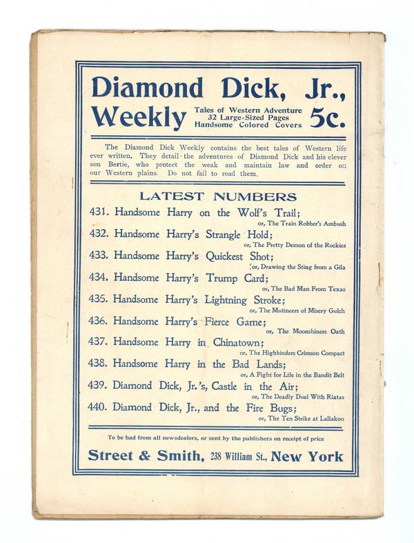 Tags: Pulp AdventurePublished Apr 1905 by Street & Smith.$17.50- Spine split 25%. Water damage: Slight. Staple rust: Slight.