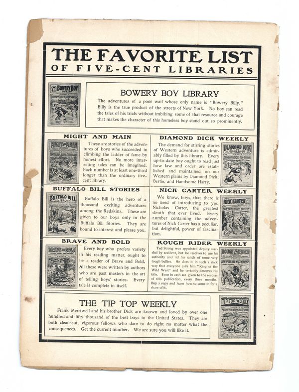 Published Sep 1906 by Street & Smith.$2.65- Spine split 90%. Cover Detached.