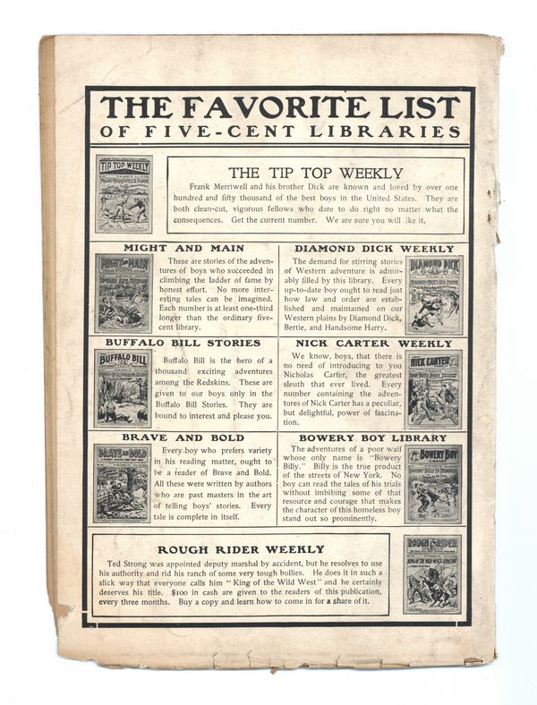 Published Jan 1907 by Street & Smith.$2.65- Spine split 90%. Cover Detached. Staple rust: Slight.