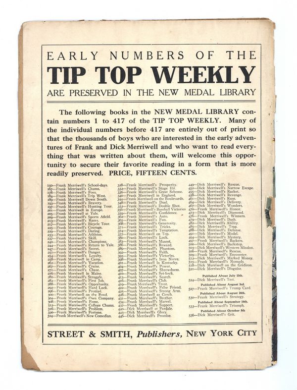 Published Jul 1909 by Street & Smith.$2.65- Spine split 90%. Cover Detached. Staple rust: Slight.