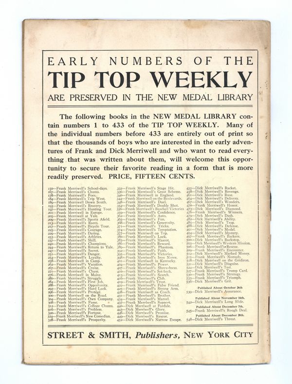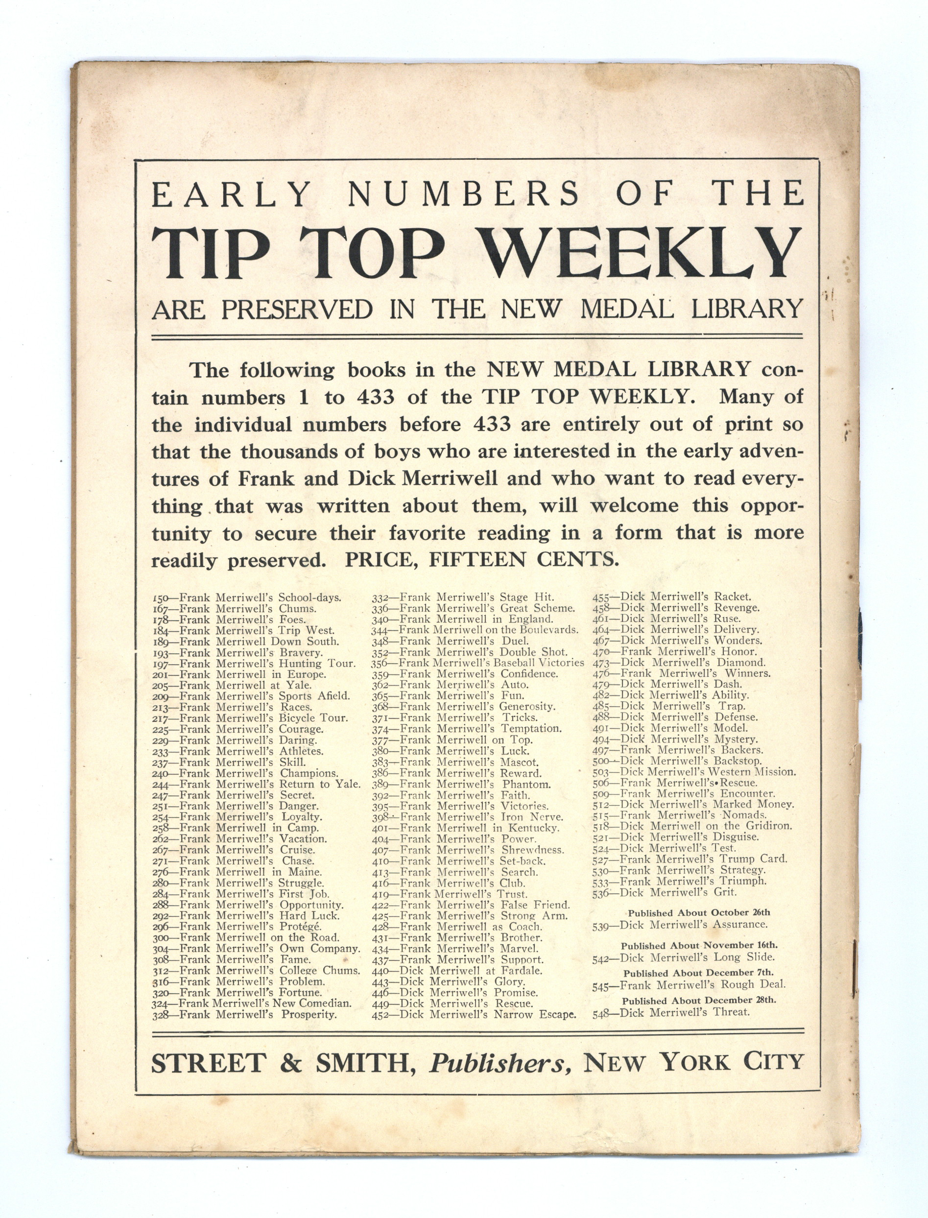 Published Nov 1909 by Street & Smith.$5.00- Spine split 60%. Staple rust: Slight.