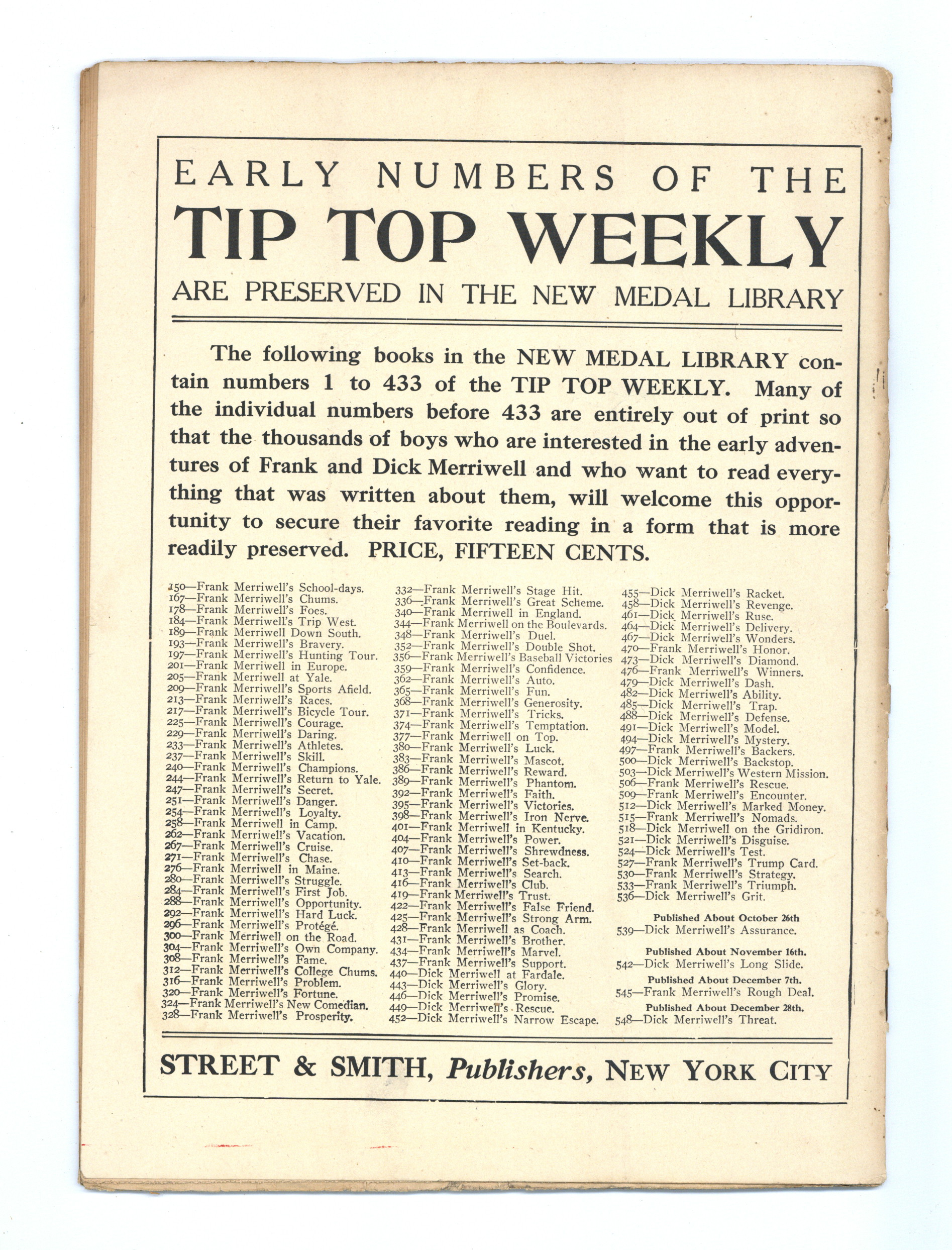 Published Apr 1909 by Street & Smith.$10.00- Spine split 40%. Staple rust: Slight.