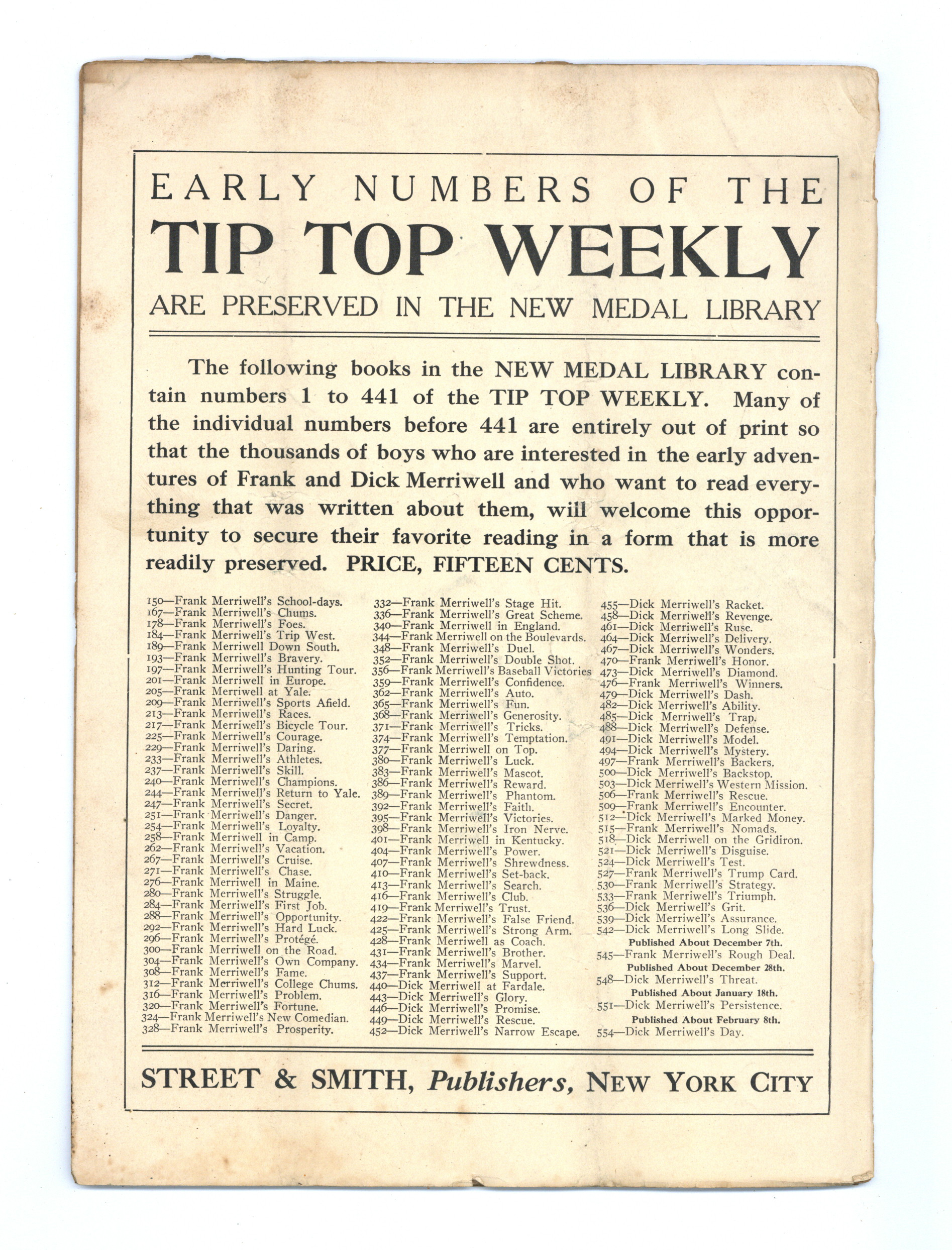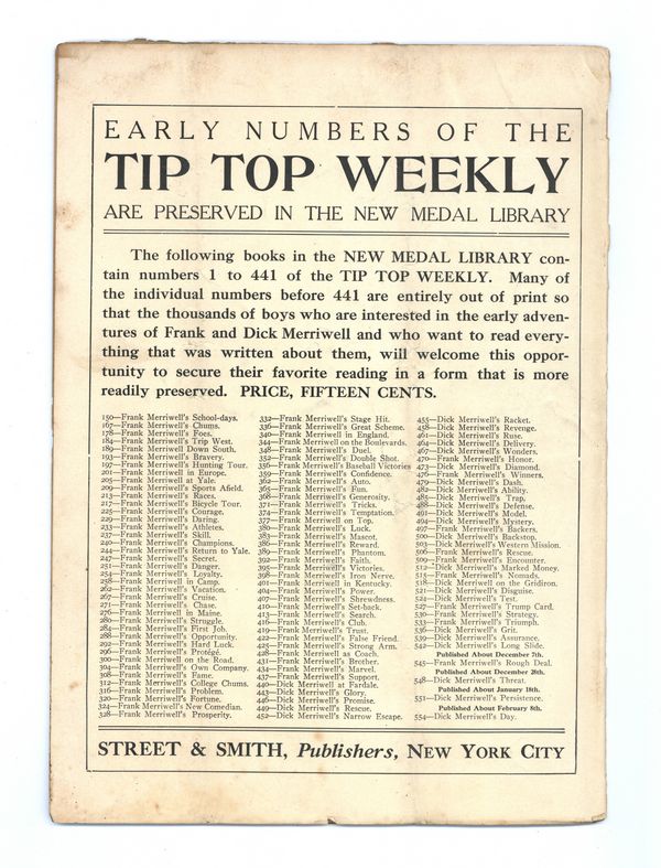 Published Dec 1910 by Street & Smith.$2.65- Spine split 90%. Cover Detached. Staple rust: Slight.