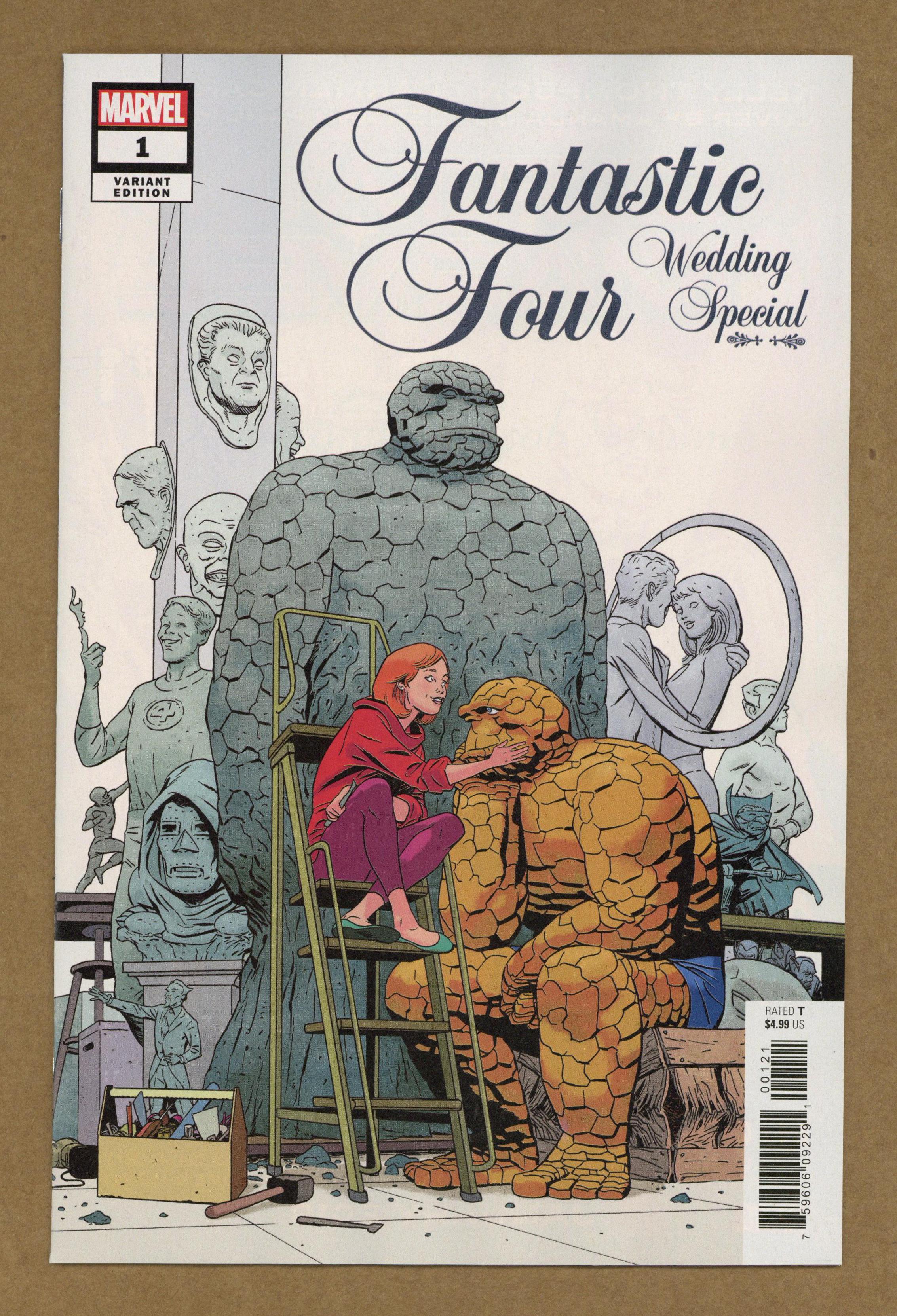 Limited 1 for 25 Retailer Incentive Variant Cover. Written by Gail Simone, Dan Slott, and Fred Hembeck. Art by Laura Braga, Mark Buckingham, Matt Yackey, and Megan Wilson. Cover by Marcos Martin. Come and celebrate the impending nuptials of the Thing and Alicia Masters with a Ladies Night Out as only the First Family of Comics can do it! Guest-starring She-Hulk, Medusa, Crystal and more, it's the bachelorette party Alicia never expected-and one whose ribaldry will be interrupted by the arrival of a Surprise Super Villain! (And no, we don't mean Johnny Storm!) Meanwhile, the Thing has an unexpected meeting with his future father-in-law, the Puppet Master! Plus, Hembeck! The Fantastic Four family tree! And more! R.S.V.P. at your local comics retailer this December, and don't forget to kiss the bride! 36 pages, full color. Rated T Cover price $4.99.