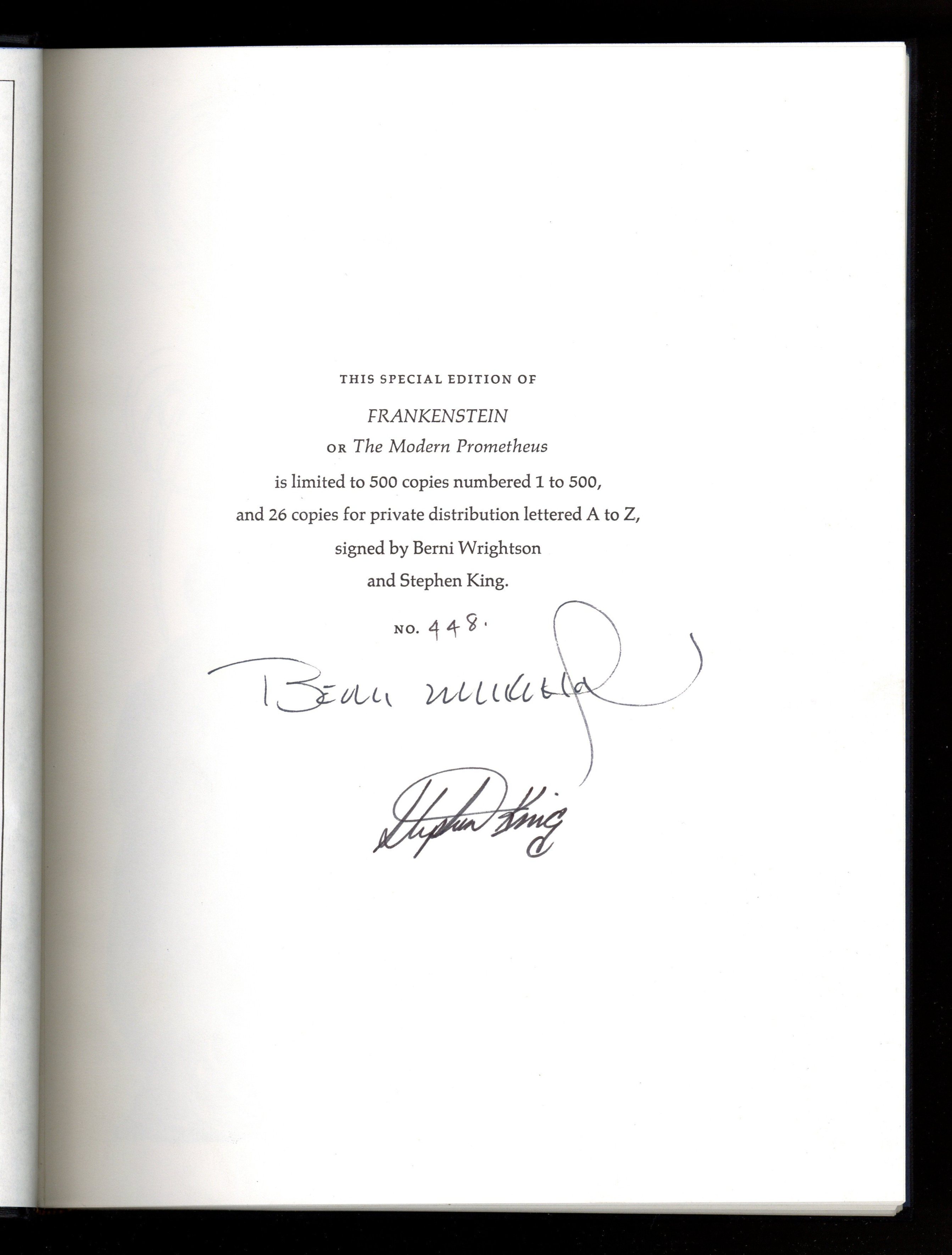 Frankenstein Deluxe Edition - Limited to 500 copies - Signed by Bernie Wrightson and Stephen King. Includes Blue slipcase. Written by Mary Wollstonecraft Shelley, illustrated by Bernie Wrightson, and introduction by Stephen King. Originally distributed in a cardboard case with publishing info and the copy number. Hardcover, 8-1/2" x 11", 192 pages, B&W.